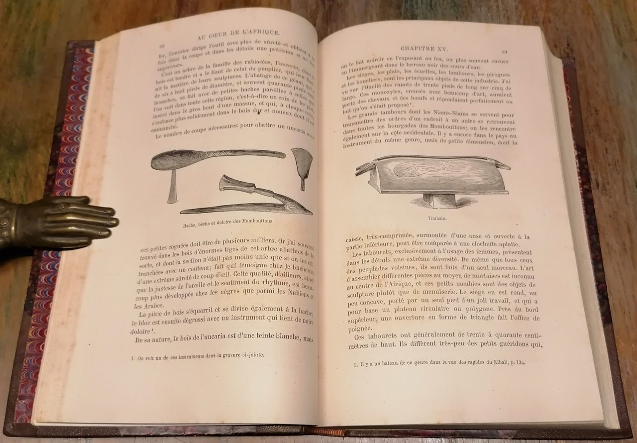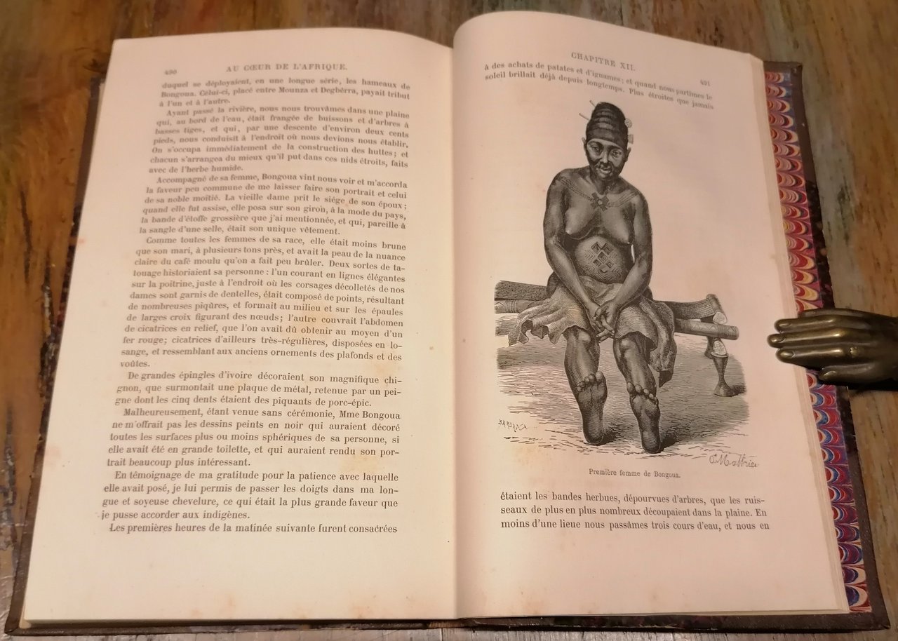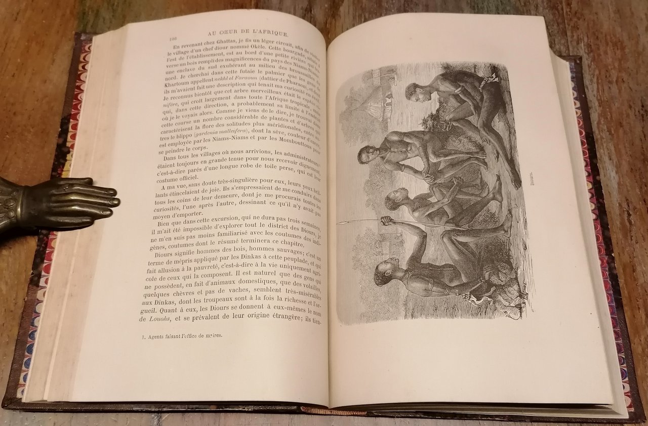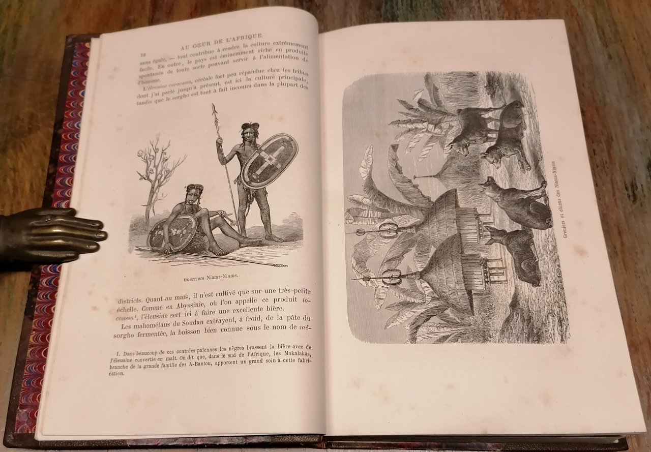 (Esplorazione dell'Africa - Viaggi - Esploratori austriaci dell'Ottocento - Sudan - Congo) Due volumi in 8°, legatura coeva in mezzo marocchino marrone con angoli e filetti dorati, dorsi a 5 nervi con titoli e fregi in oro, carte marmorizzate ai piatti ed alle guardie, pp. (4),IV,508 ; (4),434,(2), con complessive 139 incisioni in legno nel testo (anche a piena pagina) e 2 carte geografiche a colori fuori testo, di cui una più volte ripiegata. Prima traduzione in francese autorizzata dall' autore e condotta sulle edizioni inglese e tedesca da M.me H. Loreau. La relazione di viaggio nel Sudan egiziano dell'esploratore e naturalista tedesco Georg August Schweinfurth, con importanti osservazioni sul Bahr-el-Ghazal, l'alto Congo (Uelle) ed il complesso oro-idrografico della regione. Interessanti le notizie sulle popolazioni incontrate, in particolare i Niam Niam o Asande ed il popolo pigmeo degli Akka. Leggere e circoscritte tracce di ossidazione all'interno, piccolo strappetto composto alla carta ripiegata, peraltro ottimo stato di conservazione.