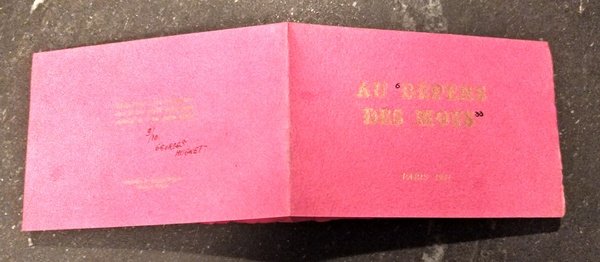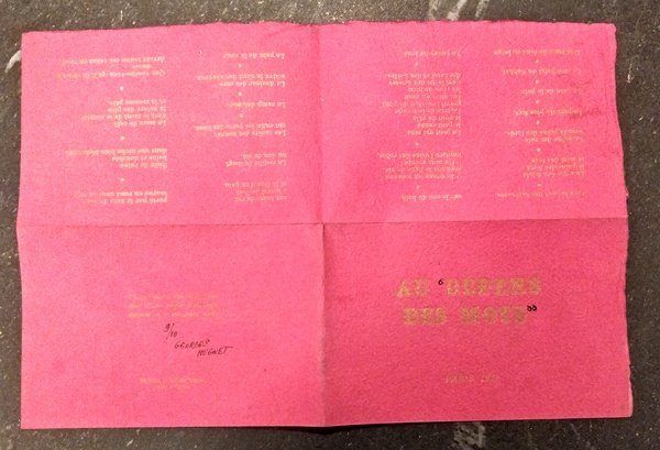 Foglio cremisi, 29.5x19.2 cm, con scritte in oro, ripiegato in quattro all'italiana, in lingua francese. All'interno sul retro poesie dell'autore stampate in oro e disegno, anch'esso stampato in oro.
