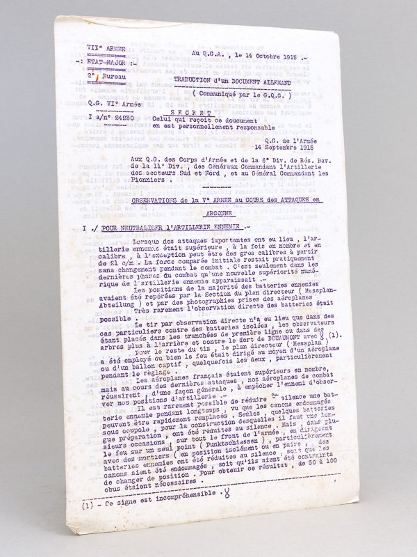 Au Q.G.A. le 14 octobre 1915. Traduction d'un document allemand (communiqué par le G. Q.G.) SECRET : Observations de la Ve Armée au Cours des Attaques en Argonne destiné "aux QG des Corps d'Armée et de la 6e Div. de Rés. Bav. de la 11e Div., des Généraux Commandant l'Artillerie des Secteurs Sud et Nord, et au Général Commandant les Pionniers"