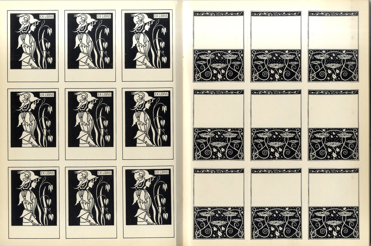 >12 fogli pretagliati, ciascuno con un differente ex-libris figurato in nero, in 9 o 16 copie ciascuno, con retro adesivo (per un totale di 122 ex-libris); broch. edit. figurata a colori. Deliziosi ex-libris da collezione, nell'inconfondibile stile di Beardsley, precursore del liberty. Perfetto esemplare.