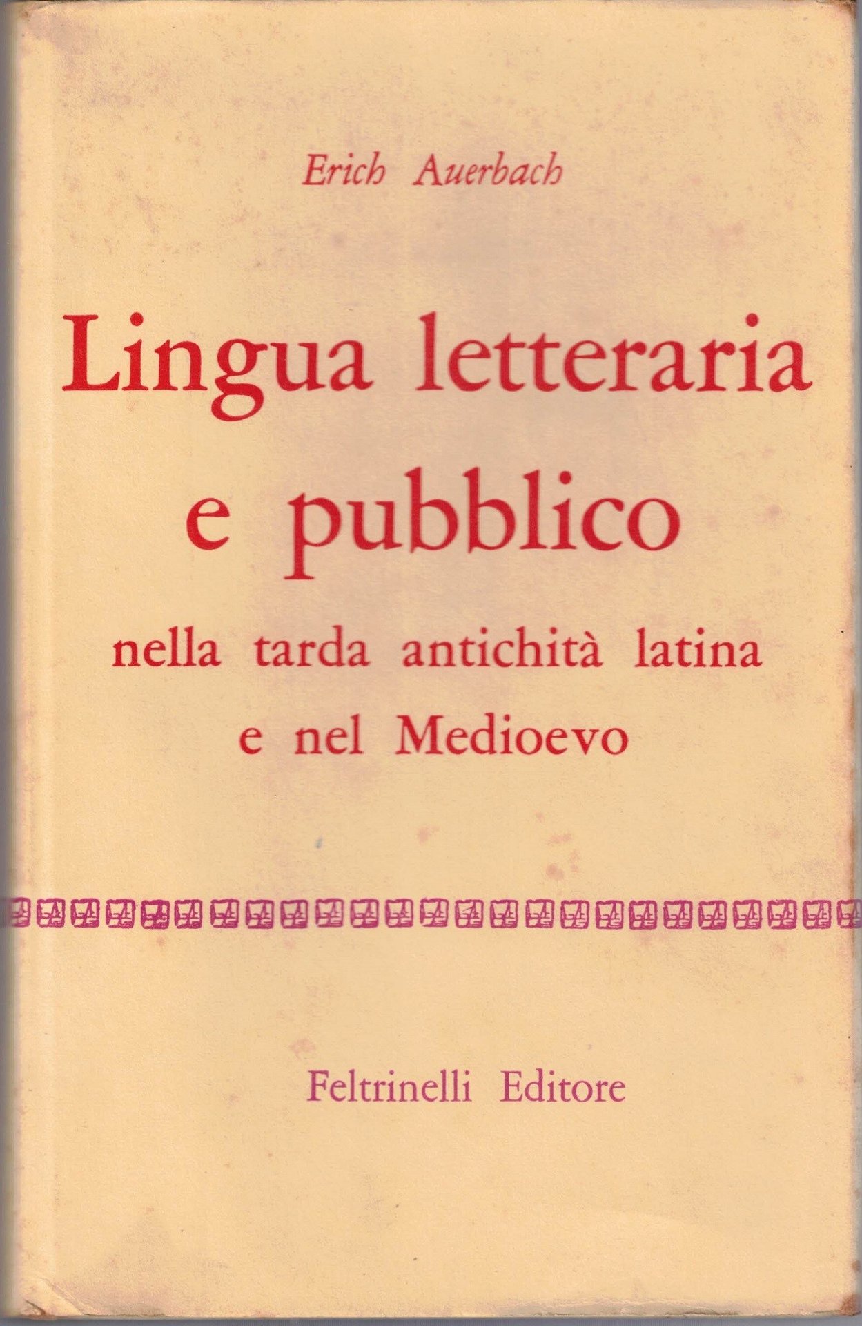 Erich Auerbach, Lingua letteraria e pubblico nella tarda antichità latina e nel Medioevo, Feltrinelli Editore, Milano 1960, prima ed., pp. 312, cm 23, tela ed. con titoli al dorso e sovraccoperta. Timbro di cartolibreria alla prima carta di guardia. Leggere tracce d’uso, alla prima metà del volume sottolineature a matita non deturpanti, ordinari segni del tempo, per il resto buona copia.