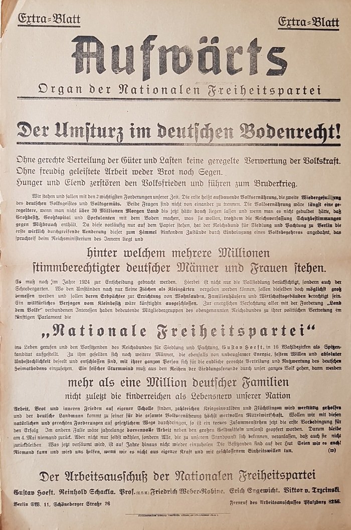 Historisches Kleinplakat der sogenannten Nationalen Freiheitspartei zur Reichstagswahl am 4. Mai 1924. Geworben wurde hier für eine gerechte Verteilung von Bodenfläche und massiver Schaffung von Kleingärten für die Bevölkerung. Im Plakattext heißt es unter anderem: "Ein frischer Sturmwind muß aus den Reihen der Siedlungsfreunde durch unser ganzes Volk gehen, dann werden mehr als eine Million deutscher Familien, nicht zuletzt die kinderreichen als Lebensnerv unserer Nation, Arbeit, Brot und inneren Frieden auf eigener Scholle finden [.]". Der 'Aufwärts' enthielt regelmäßig als Beilage den 'Siedlerboten' (Reichsbund für Siedlung und Pachtung). Sehr wahrscheinlich standen auch die Nationale Freiheitspartei und der 'Aufwärts' im Umfeld des Republikanischen Reichsbundes. Die hier vorliegende Extra-Ausgabe ist in altersentsprechend noch sehr gutem Zustand, siehe beigefügte Bilddatei. Sehr seltenes Original-Plakat aus der Weimarer Republik! - - - ACHTUNG! Dieses Buch kann wegen seines Gewichts oder seiner Größe nur als PAKET verschickt werden. Innerhalb Deutschlands 5,80 Euro. (Portokosten ins Ausland bitte erfragen.) / ATTENTION! Due to its weight or size this book can only be sent as a PARCEL. Within Germany 5,80 Euro (For shipment abroad please ask.)