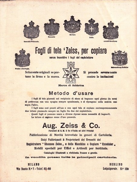 Aug. Zeiss & Co, Milano, Berlino. Fogli di tela Zeiss per copiare. Locandina pubblicitaria su tela. Carta carbone. Carta copiativa.