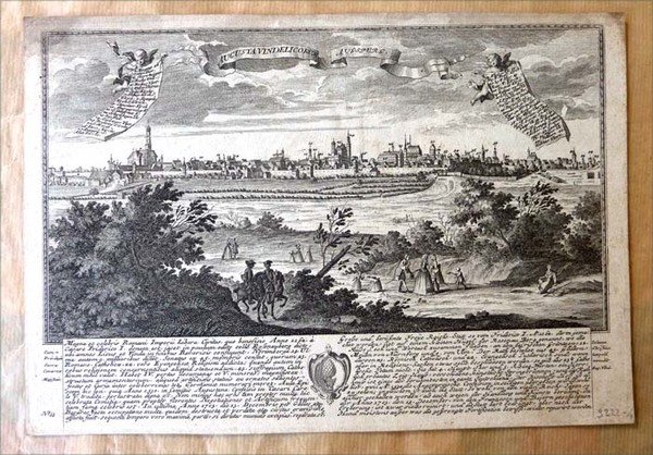 Une gravure sur cuivre de 301x207 mm.; représentant, au lointain, la ville d'Augsbourg. Gravure toute marge; aucun accroc ni déchirure. Légèrement brunie en partie haute. La gravure est numérotée N°58. Sans doute d'un travail sur les villes d'Europe. Johann Christian Leopold (1699-1755), graveur éditeur à Augsbourg possédait un atelier modeste; il y effectuait des tirages de quantité restreinte. Ses gravures sont maintenant d'une grande rareté.