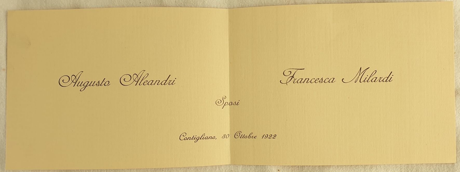 Bella partecipazione di nozze tra Augusto Aleandri e Francesca Milardi da celebrarsi a Contigliano il 30 ottobre 1922. In ottime condizioni. Formato cm 12,5x34,5.Beautiful wedding card between Augusto Aleandri e Francesca Milardi to be celebrated in Contigliano the 30rd of october 1922. <BR>In very good conditions. Size cm 12,5x34,5.
