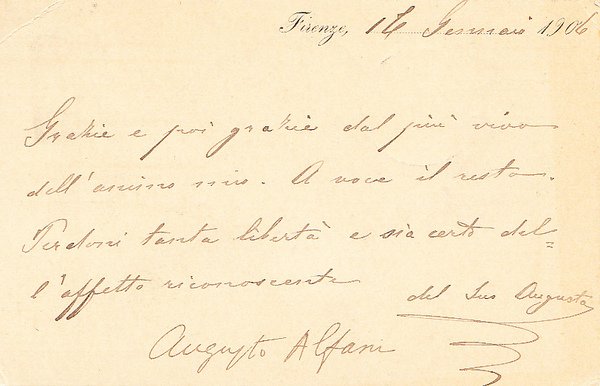 cartolina manoscritta e firmata di Augusto Alfani della R. Accademia della Crusca Firenze datata Firenze 14 Gennaio 1906; ottimo es.