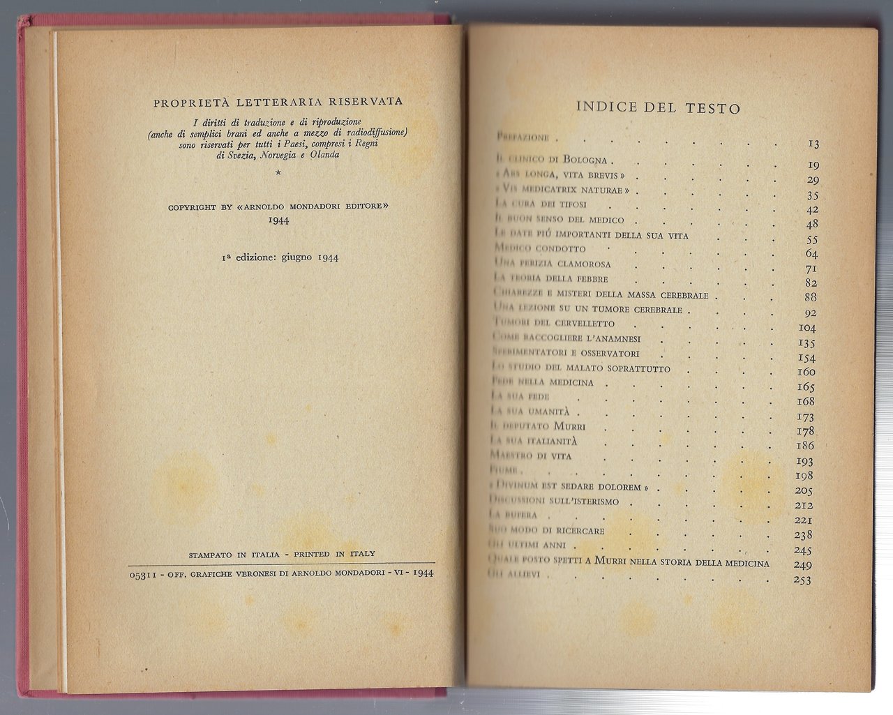Legatura editoriale in tutta tela rosa con titoli dorati al dorso e al piatto anteriore.