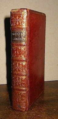 12mo (cm. 12,6), 12 cc.nn., 327(1, errata) pp. Frontis. stampato in rosso e nero. (segue con proprio frontis.) Nicolai Heinsii Dan. F. in Prudentium adnotata, ibidem, 1 c.nn., 167 pp., 17 pp.nn., 2 cc.nn. (bianche). Splendida legatura coeva in marocchino rosso con cornici oro ai piatti (piccola mancanza alla cuffia superiore). Nervi, ricchi fregi e titolo oro su tassello nero al ds. Dentelle e tagli oro. Carte di guardia marmorizzate con disegni a pettine. Margine superiore rifilato, altrimenti ottimo esemplare. Willems, 1386. Provenienza: collezione Wardington (Ex libris cartaceo al contropiatto posteriore).