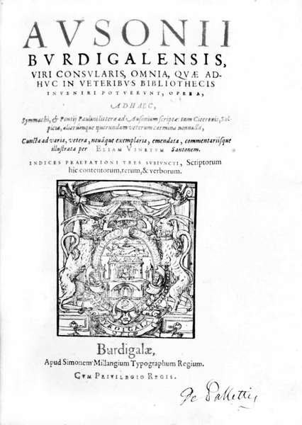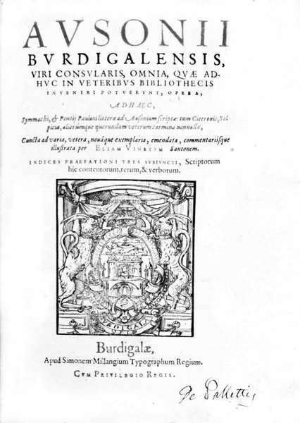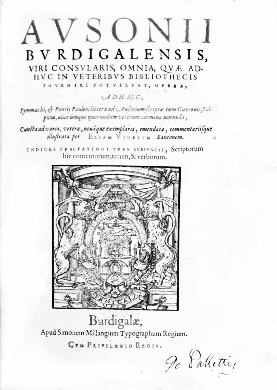 AUSONII BURDIGALENSIS, VIRI CONSULARIS, OMNIA, QUAE ADHUC IN VETERIBUS BIBLIOTHECIS INVENIRI POTUERUNT, OPERA. - Ad haec, Symmachi & Pontij Paulini littera ad Ausonium scriptae: tam Ciceronis, Sulpicia, aliorumque quorundam veterum carmina nonnulla,... illustrata per Eliam Vinetum Santonem...