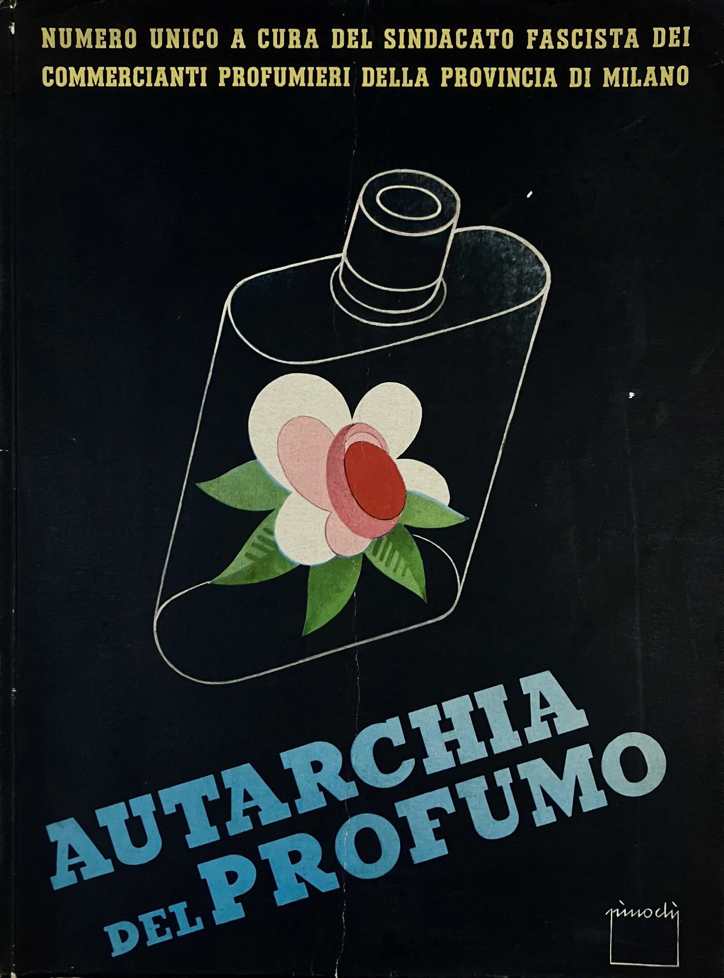 Brossura editoriale, bellissima copertina a firma di Enrico Mauro Pinochi, disegni in B/N nel testo di Brunetta (Bruna Moreni) e Filiberto Mateldi. Pubblicato in occasione della mostra "La settimana del profumo italiano" tenutasi nel novembre 1939 per pubblicizzare le ditte italiane attive nel settore. Comprende l'elenco dei vincitori del concorso delle vetrine, selezionati fra le 285 ditte partecipanti (fra cui le celebri Vermondo Valli e A. Bertelli), il racconto "La valigia di Settimo" di Leonida Repaci, un testo di Dino Falconi e un articolo sulla passione di D'Annunzio per i profumi, con 38 tavole pubblicitarie di articoli per la cosmesi maschile e femminile (Nivea, Satinine Usellini, Gi.Vi.Emme et al.). Lieve piega al piatto anteriore, strappo al margine bianco di una pagina.