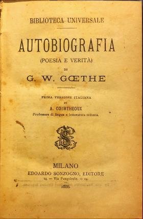 Autobiografia: Prima versione italiana di A. Courtheoux Professore di lingua e letteratura tedesca. Fausto: Traduzione di Giovita Scalvini. I dolori del giovine Werther: versione italiana di Riccardo Ceroni. In 16° (cm 16,7 x 11,5), pp. 196 + 100 + 176 + 124. Leg. mezza pelle marrone, piatti cart. marmorizzati marrone. Titolo oro al dorso. Segni di consunzione ai margini, strappi alle cuffie, abrasioni ai piatti. Tagli e pagine bruniti. Leg. stanca. Scritta alla prima sguardia libera, allultima pagina della prima opera e al frontespizio della seconda parte della seconda opera. Il volume contiene tre opere, di cui una prima versione italiana: Autobiografia (parte prima e seconda), e due seconde edizioni: Fausto (parte prima e seconda, I dolori del giovine Werther. Buone condizioni.