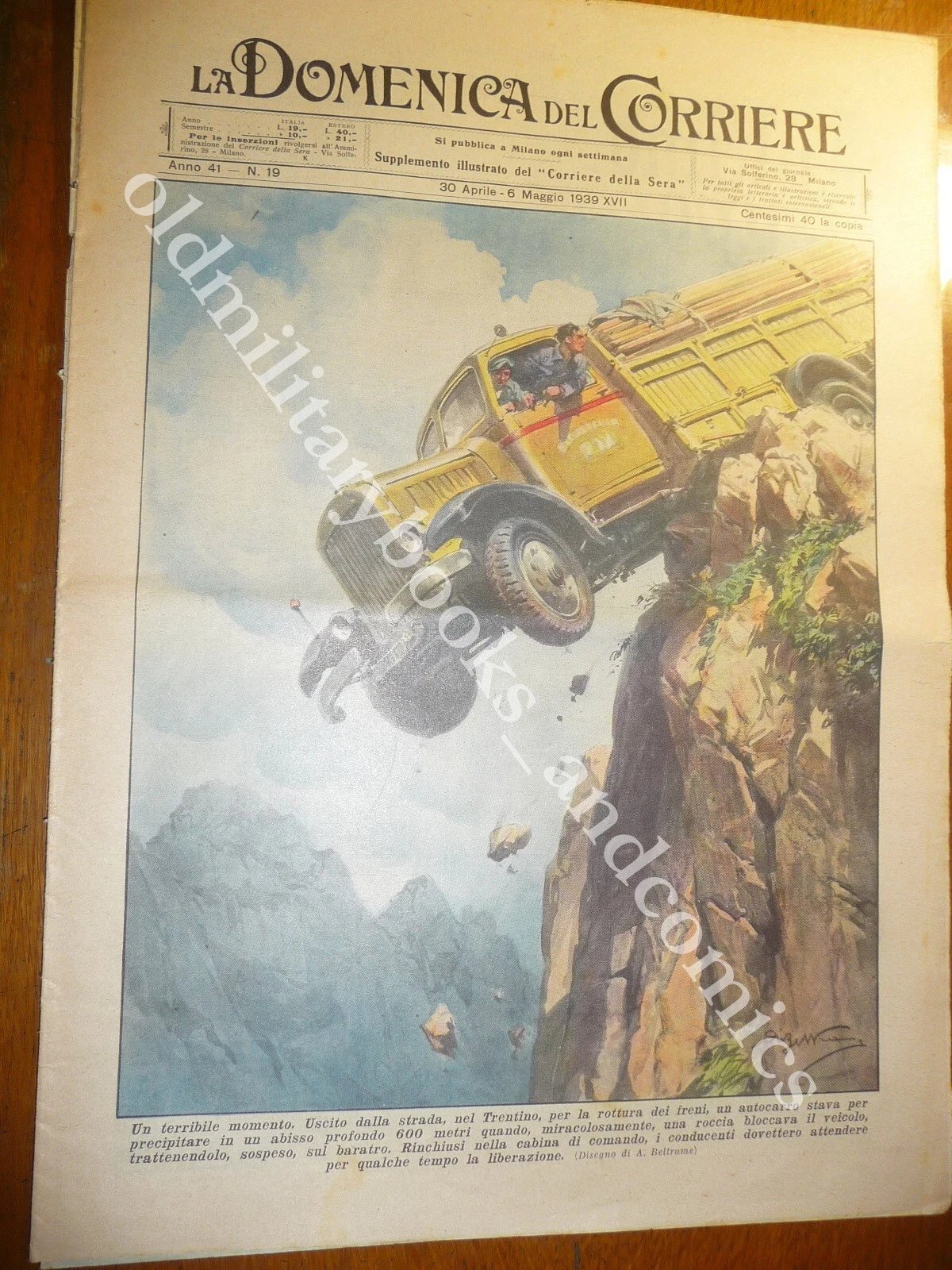 COPERTINA: Un terribile momento. Uscito dalla strada, nel Trentino, per la rottura dei freni, un autocarro stava per precipitare in un abisso profondo 600 metri quando, miracolosamente, una roccia bloccava il veicolo, trattenendolo, sospeso, sul baratro. Rinchiusi nella cabina di comando, i conducenti dovettero attendere per qualche tempo la liberazione.