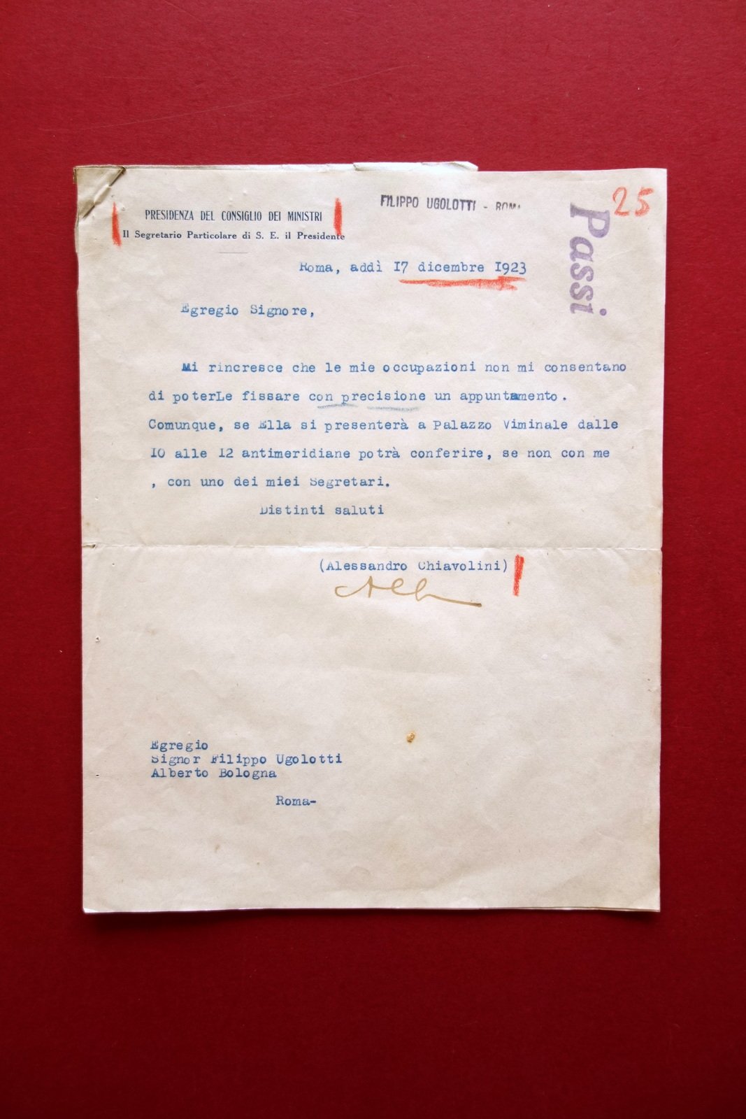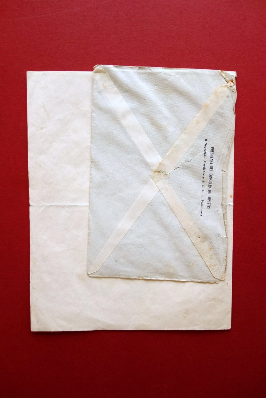 Lettera con firma autografa, Alessandro Chiavolini (1889 - 1958) lettera dattiloscritta con firma autografa datata Roma, 17 dicembre 1923 Lettera dattiloscritta su carta intestata, con firma autografa a penna al termine del testo. Cm 22,5x17,5 Acclusa la busta originale di spedizione, fissata alla lettera mediante vecchio chiodino. Condizioni di conservazione Esemplare in buono stato con tracce d'uso, normale minima traccia di piega di spedizione, poche minuscole bruniture; qualche segnetto a pastello rosso. Firma autografa su lettera dattiloscritta, in qualità di Segretario Particolare di S. E. il Presidente (Mussolini). SC03.D16862 N