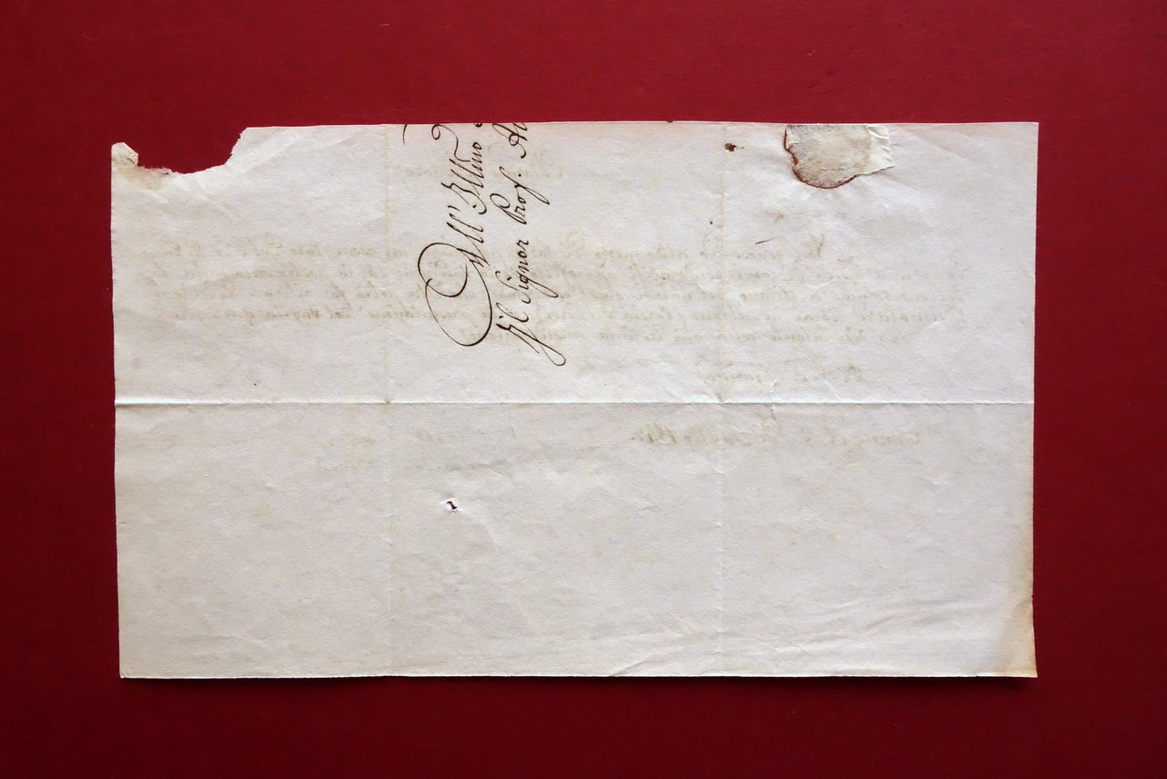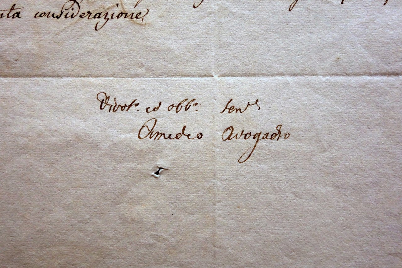 Sezione di lettera con firma autografa, Amedeo Avogadro (1776 - 1856) sezione di lettera con firma autografa datata Torino, 2 luglio 1842 1842; sezione di lettera interamente redatta a mano su carta; testo di pugno segretariale, con al termine del testo breve rigo e firma autografe dell'Avogadro (vedi foto). Parte superiore, corrispondente a vaglia per saldo di volumi, mancante (vedi descrizione sotto). Al retro parzialmente conservato l'indirizzo del destinatario. Cm 12,5x21. Condizioni di conservazione Buone condizioni con minimi segni del tempo, normali leggere tracce di pieghe per spedizione, angolo inf. sinistro con una minima pieghetta; angolo superiore destro con piccola mancanza che non comporta perdite di testo, probabilmente dovuta ad apertura della missiva. Per ulteriori dettagli vedi foto. Sezione di lettera con breve rigo e firma autografe dell'Avogadro, con la quale si annuncia l'invio del terzo e quarto tomo dell'opera Fisica de'corpi ponderabili" (importante suo lavoro in 4 volumi), "che ella potrà far ritirare dai signori Dumolard, librai in Milano [.]". La parte mancante della lettera consisteva nel vaglia da pagare al ritiro dei volumi. Autografo molto raro. SC03.D18781 N "