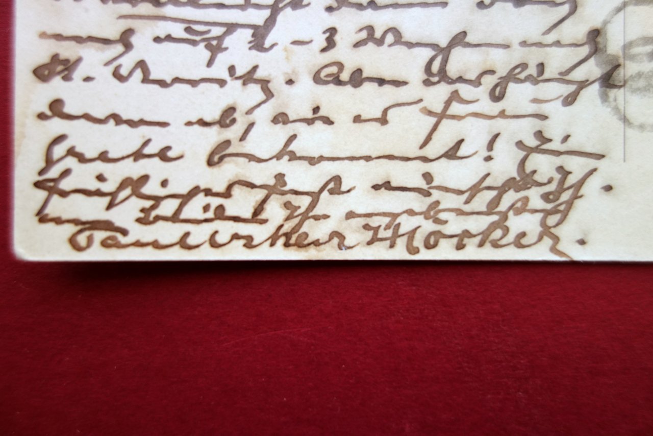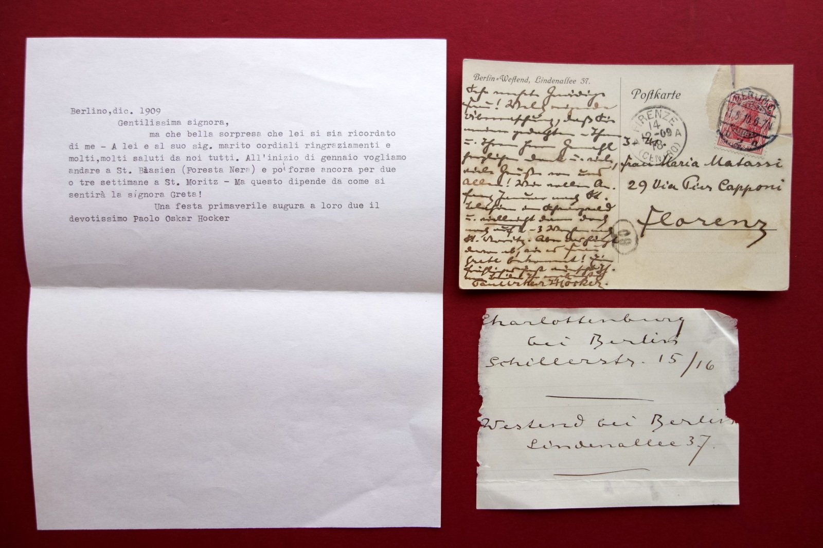 Cartolina autografa, firmata, Paul Hoecker (1865 - 1944) Cartolina con Berlino - Westend, totalmente autografa. dicembre 1909 Cartolina in b.n. viaggiata. Non datata, la data si desume dal timbro postale. Dimensioni: 9,5x14 cm. Si allega biglietto con l'indirizzo del pittore, sempre autografo. Traduzione dattiloscritta del documento. Condizioni di conservazione. Cartolina in buono stato di conservazione con leggere tracce d'uso e del tempo. Angolo sinistro abilmente e amatorialmente ricostruito. Bruniture e leggere gore. SC03.D6059 G