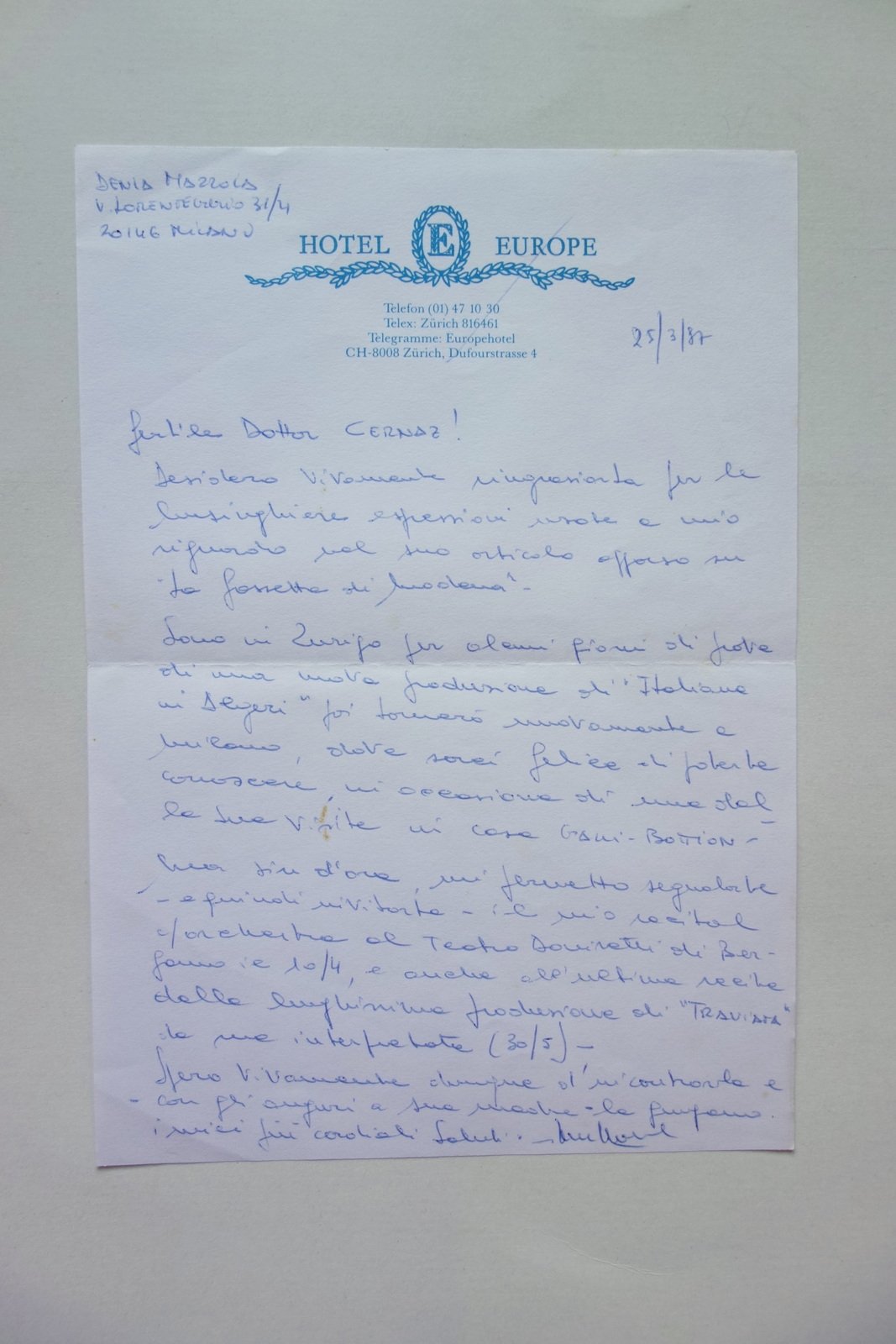 Autografo Denia Mazzola Gavazzeni Lettera Zurigo 1987 Soprano Lirica Cernaz