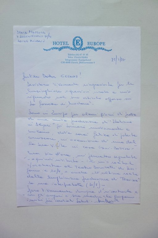 Lettera autografa, Denia Mazzola Gavazzeni (1953) lettera autografa firmata datata 25 marzo 1987 1987; lettera autografa firmata su carta intestata dell'Hotel Europe di Zurigo; testo ad un'unica facciata, con firma autografa al termine del testo. Retro bianco. Cm 21x15. Condizioni di conservazione Esemplare complessivamente molto ben conservato, con normale piega centrale per spedizione. Per maggiori dettaglli vedi foto. Bella lunga lettera autografa al critico Cernaz, per ringraziarlo dei suoi elogi e per invitarlo alle sue prossime apparizioni teatrali. SC03.D17150 N