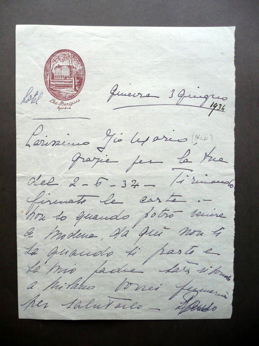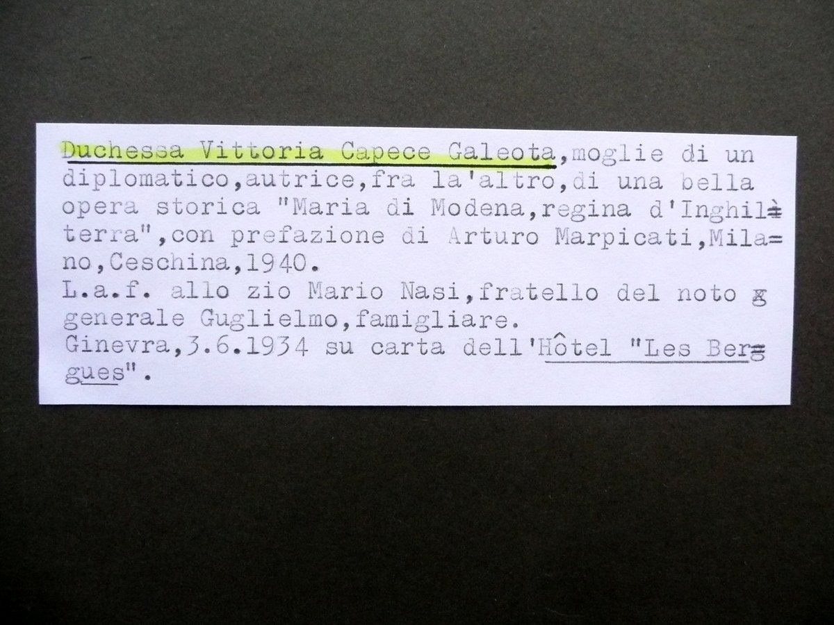 Lettera autografa, Duchessa Vittoria Capece Galeota Zuccoli Lettera autografa firmata Datata Ginevra, 3 giugno 1934 Lettera autografa firmata su foglio in carta con intestazione dell'Hotel Les Bergues - Genève", datata Ginevra, 3 giugno 1934; testo disposto ad entrambi i lati, con firma autografa al termine del testo. Cm 18,5x14. Accluso schedino dattiloscritto del precedente collezionista che contiene una breve biografia della Galeota Zuccoli e una breve descrizione dell'autografo (vedi foto). Condizioni di conservazione Libretto ben conservato con leggere tracce d'uso, normale minima traccia di piega centrale di spedizione, poche brevi note a matita / tracce di note a matita del precedente collezionista. Un margine est. con minime irregolarità. Per ulteriori informazioni sulla Duchessa Galeota Zuccoli e sul contenuto dell'autografo vedi foto schedino. SC03.D12432 N "
