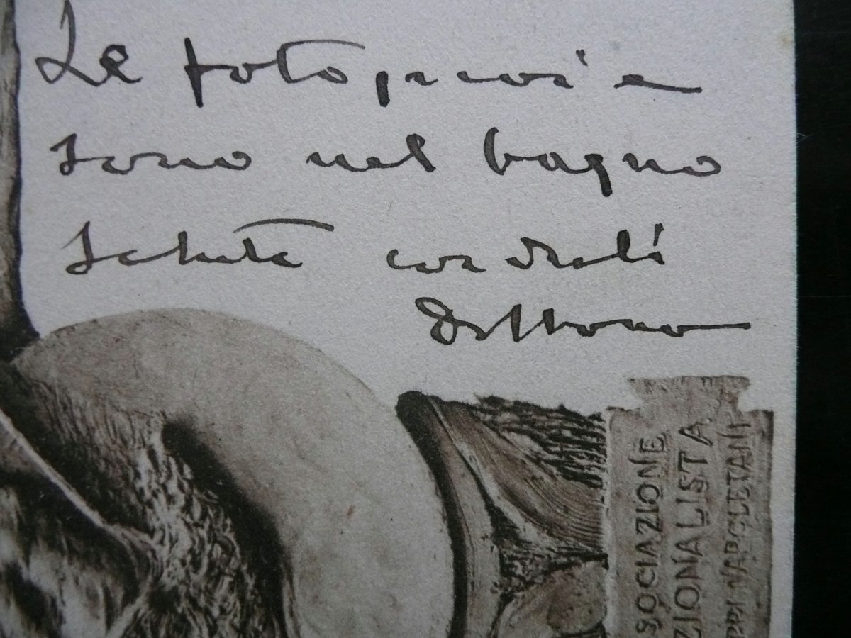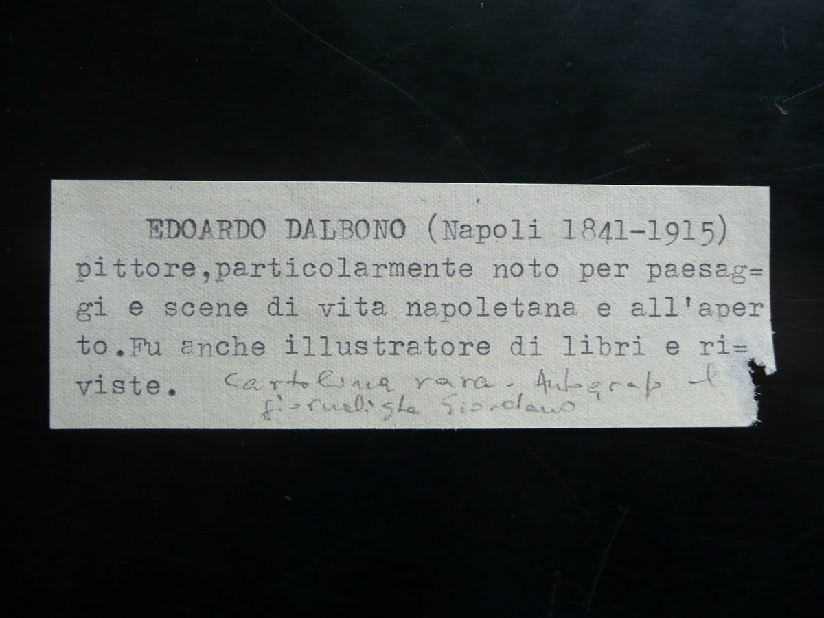 Cartolina postale autografa, Edoardo Dalbono (Napoli 1841 - Ivi 1915) Cartolina postale Pro Flotta Aerea Associazione Nazionalista Gruppi Napoletani interamente autografa e firmata datata 29 Ottobre 1913 1913, bellissima e rara cartolina postale con illustrazione della Pro Flotta Aerea - Associazione Nazionalista Napoletana; retro con breve testo e firma entrambi autografi del Dalbono (vedi foto), il quale è anche l'illustratore della suddetta cartolina. Cm 13,5x9. Accluso uno schedino dattiloscritto del precedente collezionista che contiene una breve biografia del Dalbono. Condizioni di conservazione Cartolina in buone condizioni con trascurabili difetti agli angoli; due angoli del fronte con una leggera abrasione da distacco per precedente conservazione in album (vedi foto). Bellissima e rara cartolina autografa e firmata dal pittore napoletano Edoardo Dalbono, il quale è anche l'illustratore della suddetta cartolina. Intestazione della Pro Flotta Aerea - Associazione Nazionalista Gruppi Napoletani. SC03.D10137 N