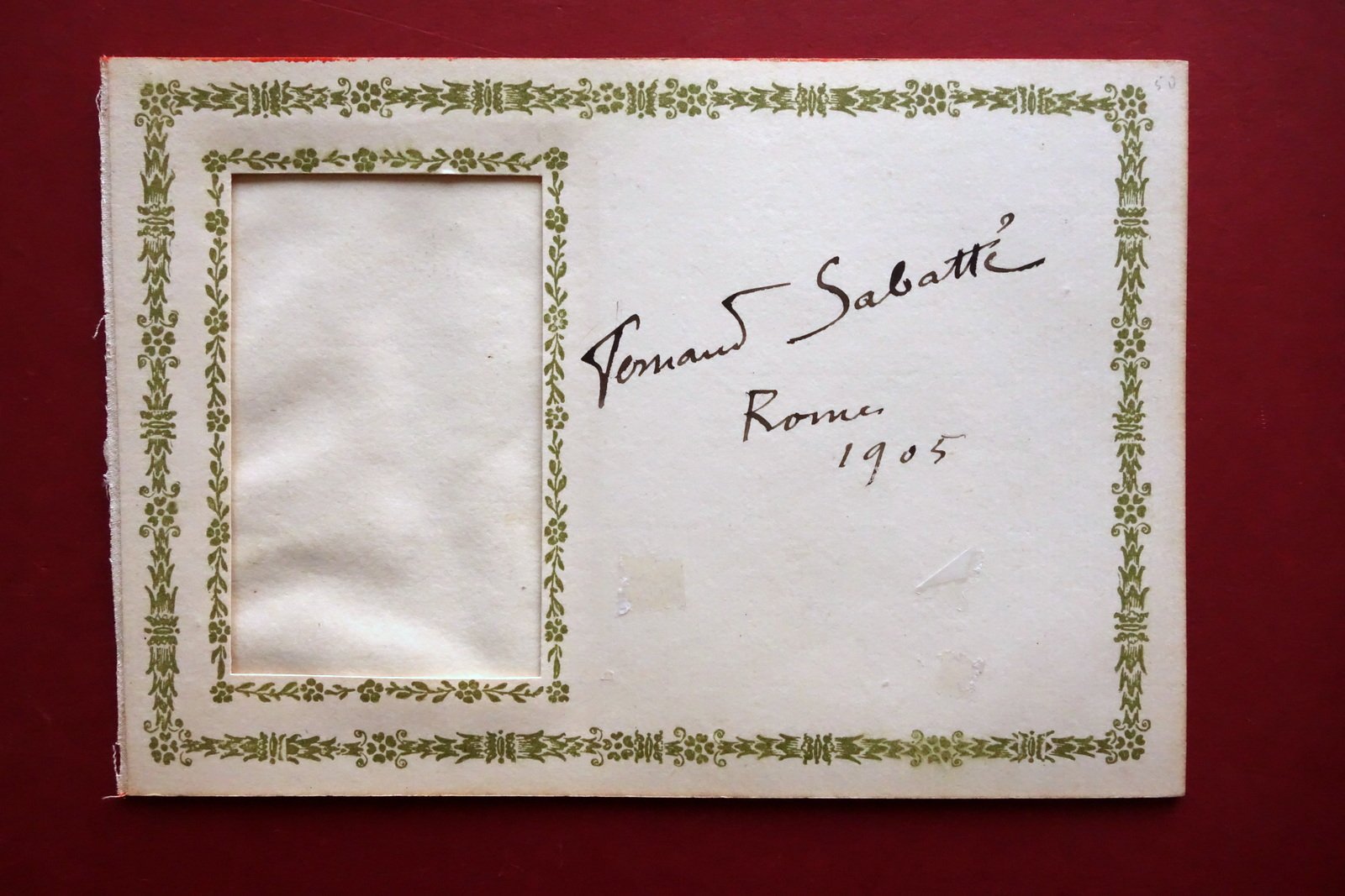 Autografo, Fernand Sabatté (1874 - 1940) cartoncino autografo datato Roma, 1905 1905; cartoncino autografo firmato (vecchia pagina d'album); al lato sinistro spazio per la fotografia / ritratto. Dimensioni: cm 13x19. Condizioni di conservazione Buone condizioni con minimi segni del tempo; al margine inferiore minime tracce di nastro adesivo per precedente elemento applicato. Per ulteriori dettagli vedi foto. SC03.D19699 N