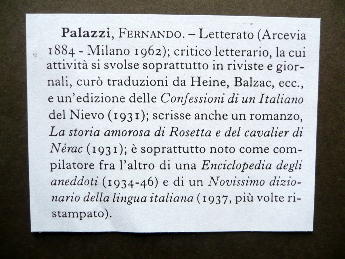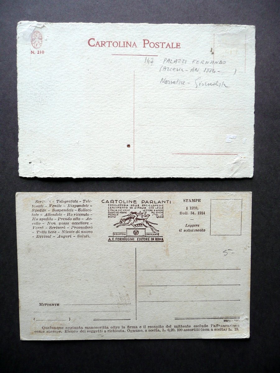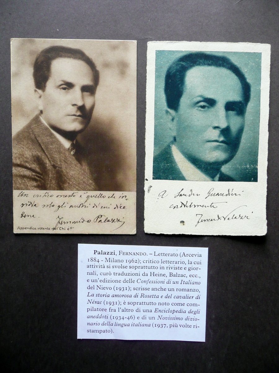 Cartolina postale autografa, Fernando Palazzi (Arcevia 1884 - Milano 1962) Cartolina postale autografa firmata S. d. (primo Novecento circa); cartolina postale autografa firmata, con applicato un ritratto fot. del Palazzi virato al verde (vedi foto); non viaggiata. Cm 14x9. Sono acclusi una cartolina postale appartenente alla serie delle cartoline parlanti" del Formiggini, con un ritratto fotogr. seppiato del Palazzi e un suo autografo fac - simile (vedi foto), e uno schedino a stampa del precedente collezionista che contiene una breve biografia del Palazzi. Condizioni di conservazione Autografo in buone condizioni con tracce d'uso, poche minuscole macchiette e qualche pressoché trascurabile traccia di sporco, retro dei quattro angoli con piccole lievi abrasioni e tracce di nastro adesivo per precedente conservazione dell'esemplare in album (vedi foto); margini frastagliati. SC03.D11555 N "