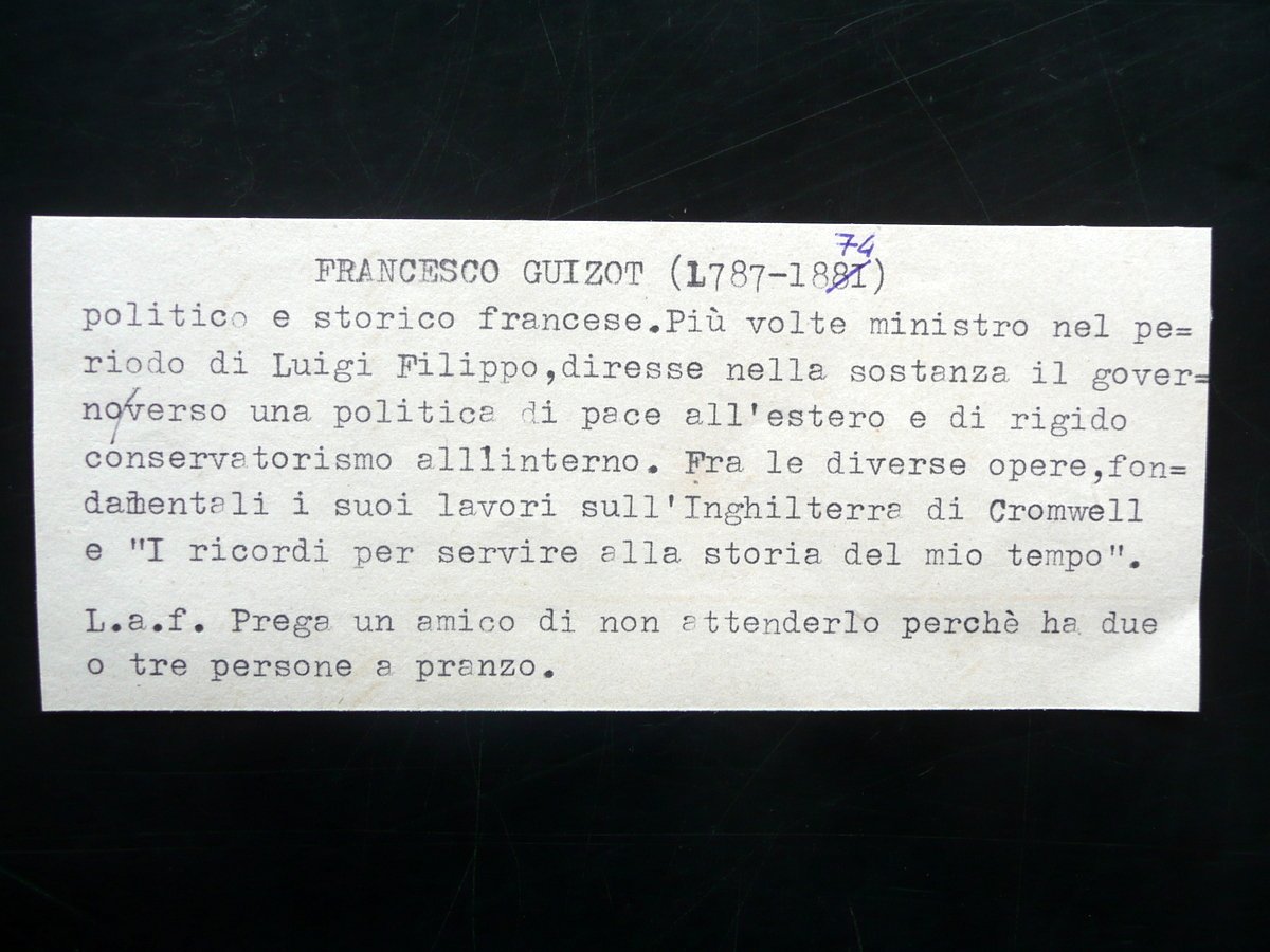 Lettera autografa firmata, François - Pierre - Guillaume Guizot (Nimes 1787 - Abbazia di Val-Richer 1874) Lettera interamente autografa e firmata S. d.; lettera interamente autografa e firmata su bifolio in carta; testo e firma disposti ad un'unica facciata; firma autografa al termine del testo; cm 15x10. Testo in francese. Un margine della quarta facciata con una rimovibile annotazione numerica a matita. Accluso uno schedino dattiloscritto del precedente collezionista che contiene breve biografia del Guizot e una schematica descrizione dell'autografo. Condizioni di conservazione Esemplare ben conservato con tracce d'uso, normali pieghe di spedizione, poche minime bruniture; due angoli della quarta facciata con traccia di nastro adesivo, dovute a precedente conservazione dell'esemplare in album. Per ulteriori informazioni sul Guizot e sul contenuto dell'autografo vedi foto schedino. Testo in francese. SC03.D10644 N