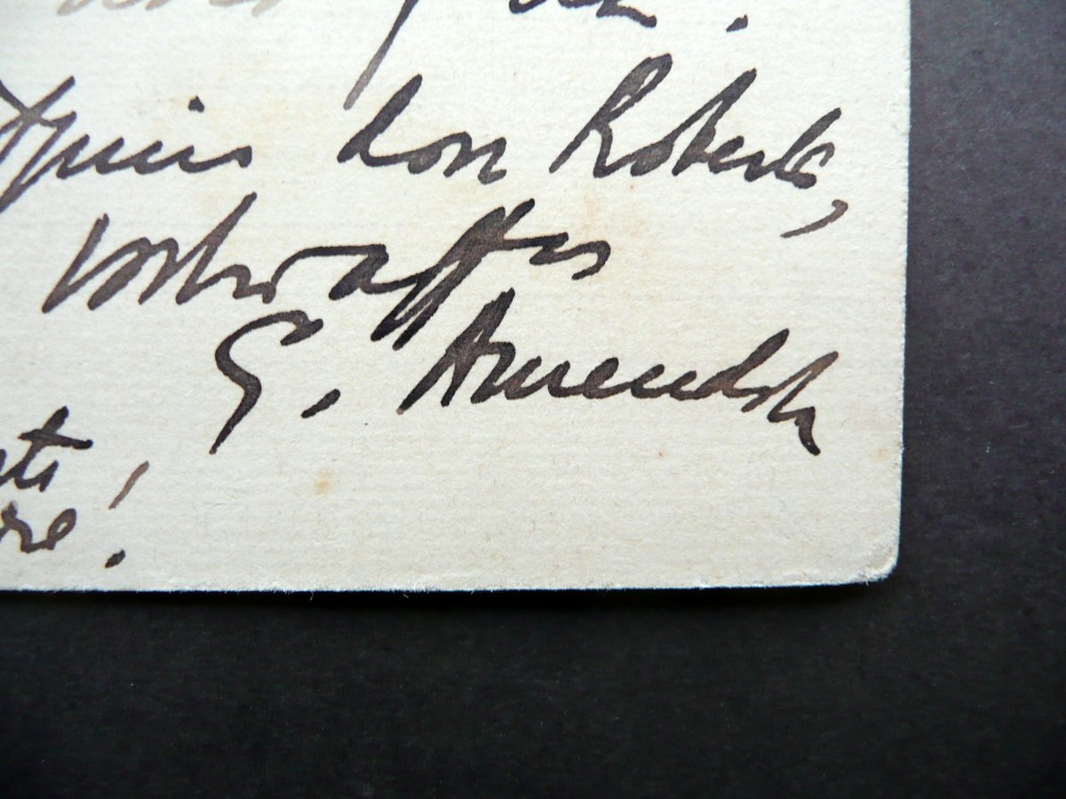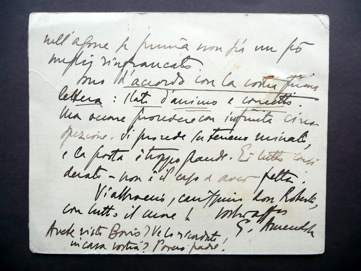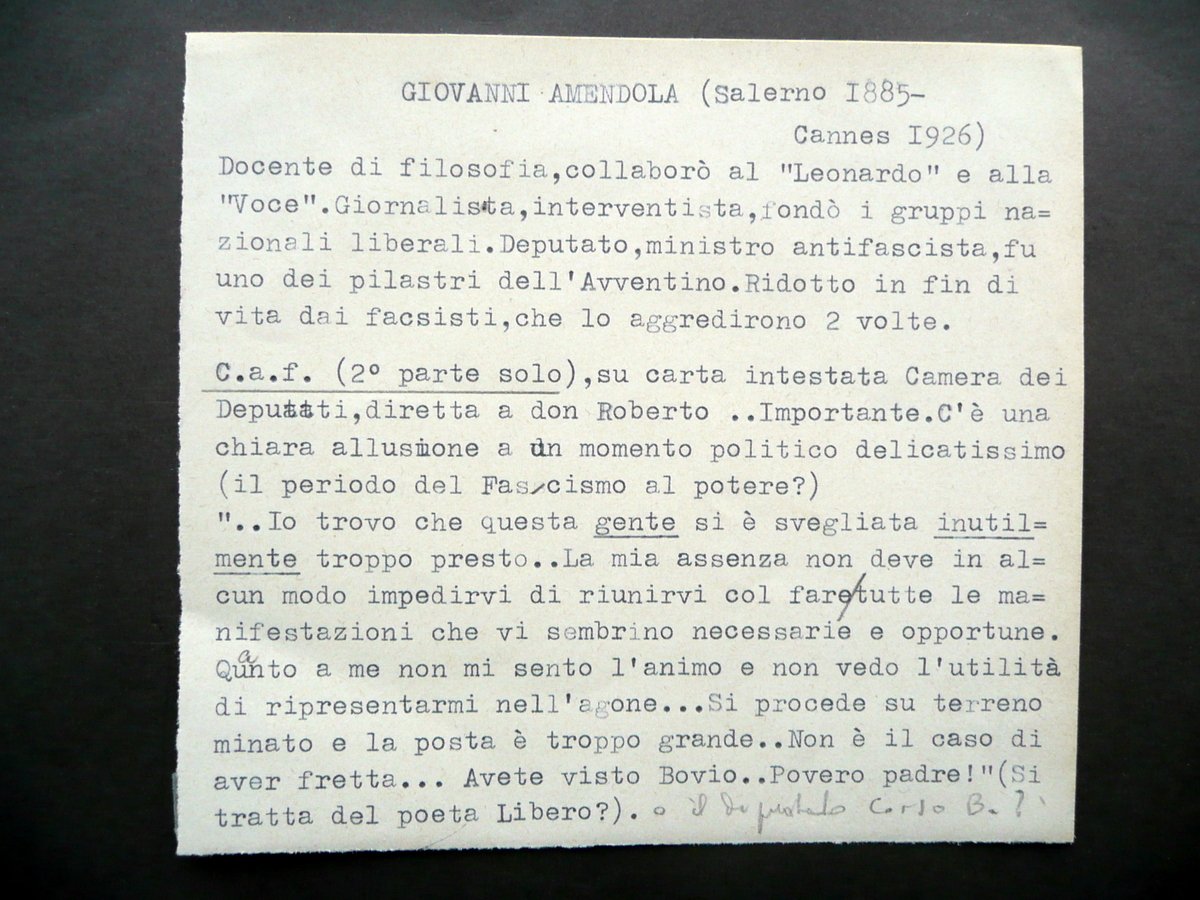 Cartoncino autografo, † Giovanni Amendola (Napoli 1885 - Cannes 1926) Cartoncino autografo firmato (solo la seconda parte) Anni '20 del Novecento Cartoncino autografo firmato con intestazione a stampa della Camera dei Deputati", s. d. (anni '20 del Novecento); testo disposto ad entrambi i lati, con firma autografa al termine del testo (vedi foto). Cm 11x13,5. Solo seconda parte. Sono acclusi uno schedino dattiloscritto del precedente collezionista che contiene una biografia dell'Amendola e una descrizione dell'autografo, e un cartoncino con un ritratto fotogr. in b/n e una biografia dell'Amendola (vedi foto). † Condizioni di conservazione Autografo ben conservato con tracce d'uso, margini e angoli con qualche minimo difetto e accenno di pieghetta, parte sup. con una piccola traccia e due trascurabili forellini per precedente inserimento di vecchia spillatura (vedi foto); un margine est. del fronte con due piccole tracce di nastro adesivo dovute a precedente inserimento dell'esemplare in album (vedi foto). † Bel cartoncino autografo firmato, che contiene alcune informazioni e disposizioni in relazione ai primi passi compiuti dal fascismo al potere. Solo seconda parte dell'autografo. Per ulteriori informazioni sull'Amendola e sul contenuto dell'autografo vedi foto schedino e cartoncino. † SC03.D12109 N "