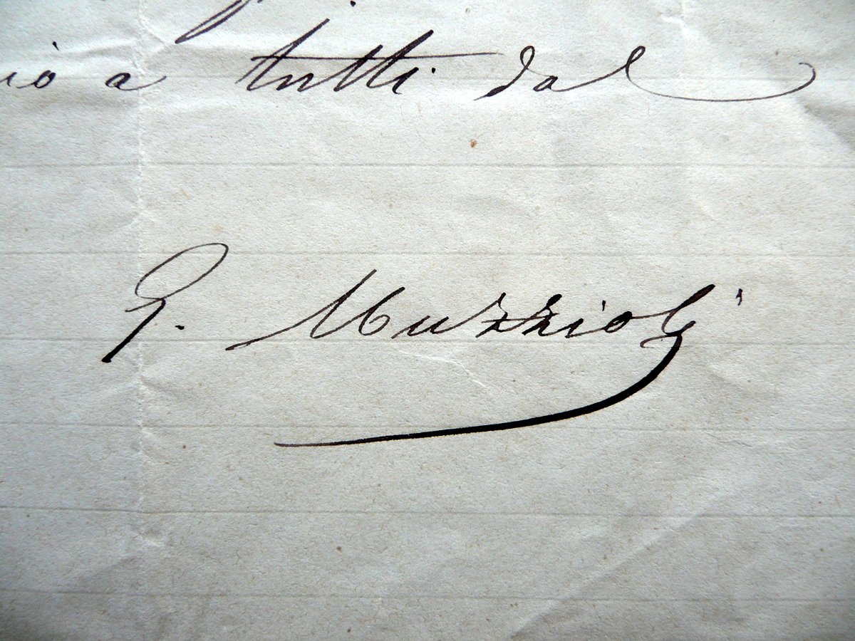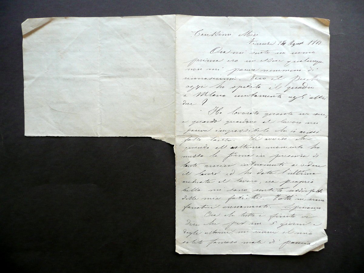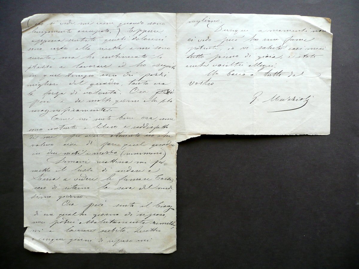 Lettera autografa firmata, Giovanni Muzzioli (Modena 1854 - Ivi 1894) Lettera autografa firmata Datata Firenze, 14 Agosto 1883 Lettera autografa firmata su bifolio in carta, datata Firenze, 14 Agosto 1883; testo disposto su tre facciate, con firma autografa al termine del testo. Cm 21x13,5. Condizioni di conservazione Esemplare ben conservato con tracce d'uso, normali pieghe di spedizione, qualche traccia di pieghetta principalmente agli angoli; mancanza della metà inferiore della terza e quarta facciata, ma testo autografo del Muzzioli completo (vedi foto). Bella lettera redatta da Firenze, di contenuto intimo e personale, redatta un anno prima della morte: [.] Ora mi sento un uomo, prima ero un essere qualunque, non mi pareva nemmeno di riconoscermi. Ecco il perché oggi ho spedito il quadro a Milano [.] Ho lavorato quanto un cane e quando pensavo al lavoro mi pareva impossibile che io avessi fatto tutto [.] Quando all'ultimo momento ho messo la firma in presenza di tanti amici intervenuti a vedere il lavoro, ho dato l'ultima occhiata al lavoro, era proprio bello mi sono sentito soddisfatto delle mie fatiche. [.]". In seguito tratta del suo noto mal di pancia, descrivendo le peculiarità di suo tale disturbo, "[.] ma ho continuato lo stesso a lavorare ed ho eseguito in quel tempo uno dei pezzi migliori del quadro, tanto era la forza di volontà [.]". SC03.D11717 N "