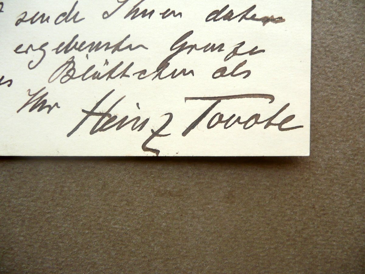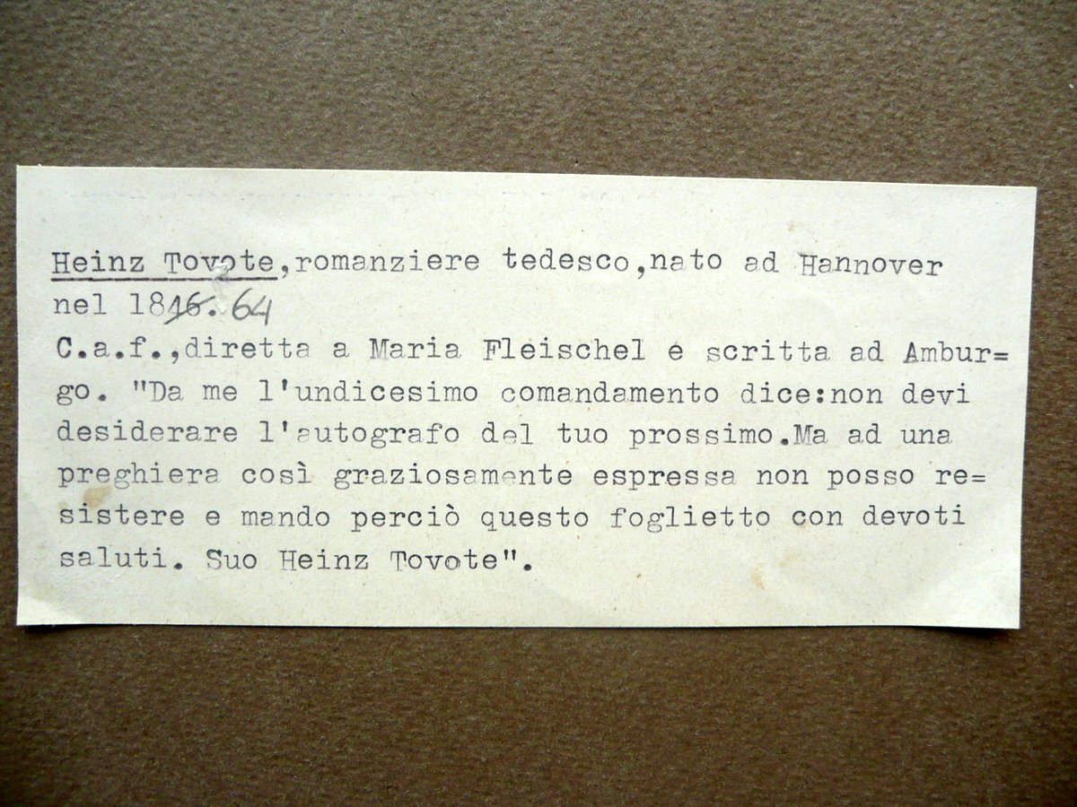 Cartolina postale autografa, Heinz Tovote (Hannover 1864 - Berlino 1946) Cartolina postale interamente autografa e firmata Cartolina postale ill. in b/n, interamente autografa e firmata, s. d. (fine '800 circa); testo e firma disposti ad un'unica facciata (la firma è al termine del testo). Cm 9,5x14,5. Testo in tedesco. Accluso uno schedino dattiloscritto del precedente collezionista che contiene una breve biografia del Tovote e una libera traduzione in italiano dell'autografo (vedi foto). Condizioni di conservazione Esemplare in buone condizioni con leggere tracce d'uso; retro dei quattro angoli con piccole leggere abrasioni e tracce di nastro adesivo dovute a precedente conservazione dell'esemplare in album; margine inf. del retro con una breve annotazione a matita del precedente collezionista. Per ulteriori informazioni vedi foto schedino, il quale contiene anche una libera traduzione in italiano dell'autografo. SC03.D10805 N