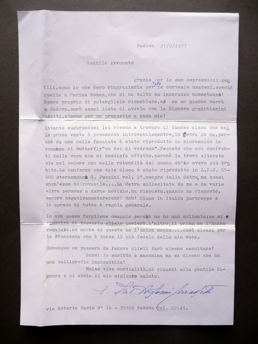 Autografo Iris Adami Corradetti Lettera Padova 21/9/1977 Soprano Lirica Musica