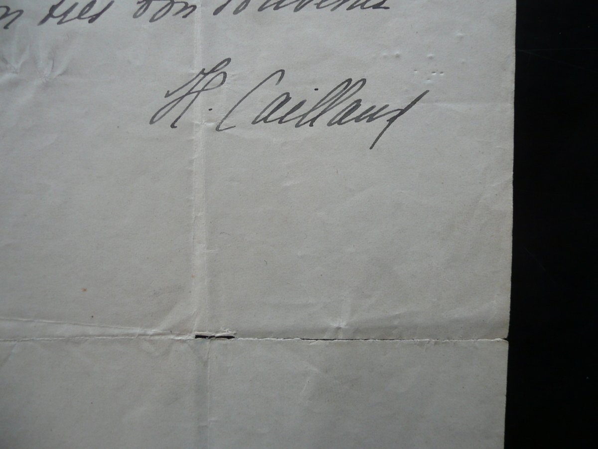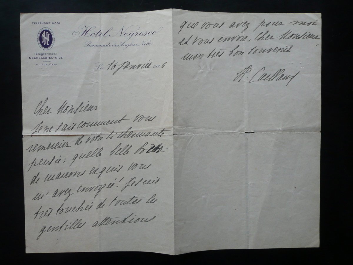 Lettera autografa, Joseph Caillaux (Le Mans 1863 - Mamers 1944) Lettera interamente autografa e firmata datata 16 Gennaio (?) 1926 Lettera interamente autografa e firmata su bifolio con intestazione dell' Hotel Negresco - Promenade des Anglais, Nice, datata 16 Gennaio (?) 1926; testo disposto su due facciate; firma autografa al termine del testo. Cm 21,5x13,5. Testo in francese. Condizioni di conservazione Esemplare in buone condizioni con tracce d'uso, normali pieghe di spedizione; presenza di due strappi di alcuni cm in corrispondenza della piega centrale (vedi foto). Lettera di ringrazionamento interamente autografa e firmata da Joseph Caillaux, Primo Ministro di Francia dal giugno 1911 al gennaio 1912. Ricoprì in seguito anche la carica di Ministro delle Finanze, e fu membro del Senato della Repubblica. Testo in francese. SC03.D10452 N