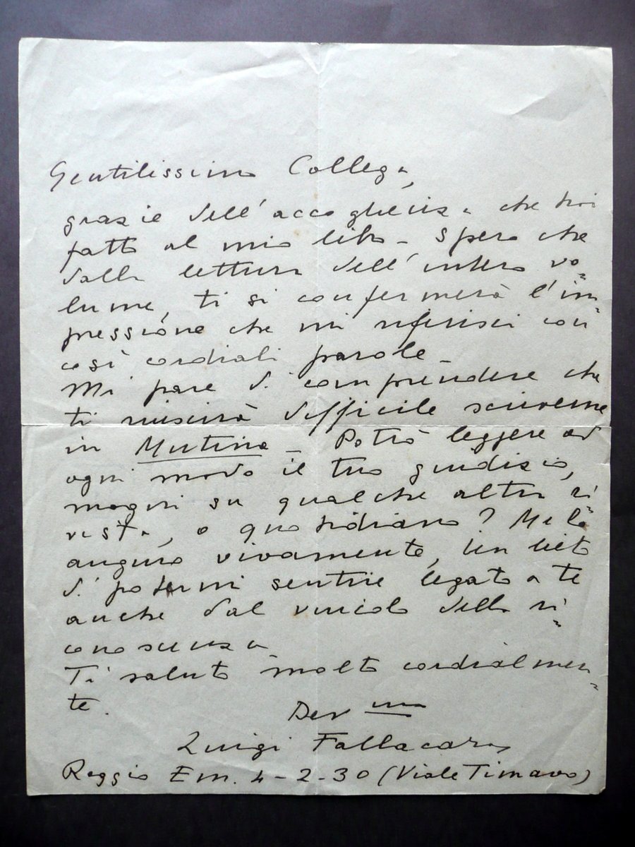 Autografo Luigi Fallacara Lettera Reggio Emilia 4/2/1930 Scrittore Bari Lettere