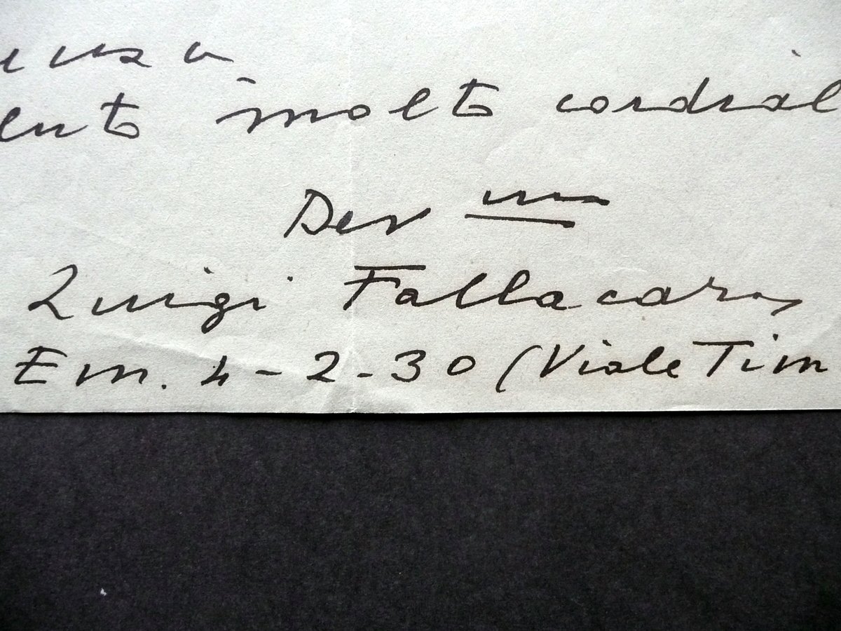 Lettera autografa, Luigi Fallacara (Bari 1890 - Firenze 1963) Lettera autografa firmata Datata Reggio Emilia, 4 febbraio 1930 Lettera autografa firmata su foglio in carta, datata Reggio Emilia, 4 febbraio 1930; testo e firma disposti ad un'unica facciata (la firma è al termine del testo; vedi foto). Cm 28,5x22. Condizioni di conservazione Esemplare in buone condizioni con tracce d'uso, normali pieghe di spedizione; pochissime minuscole bruniture. Bella lettera autografa firmata a un collega scrittore (Guanda? Delfini?), nella quale ringrazia per la positiva accoglienza critica di una sua opera. SC03.D11408 N