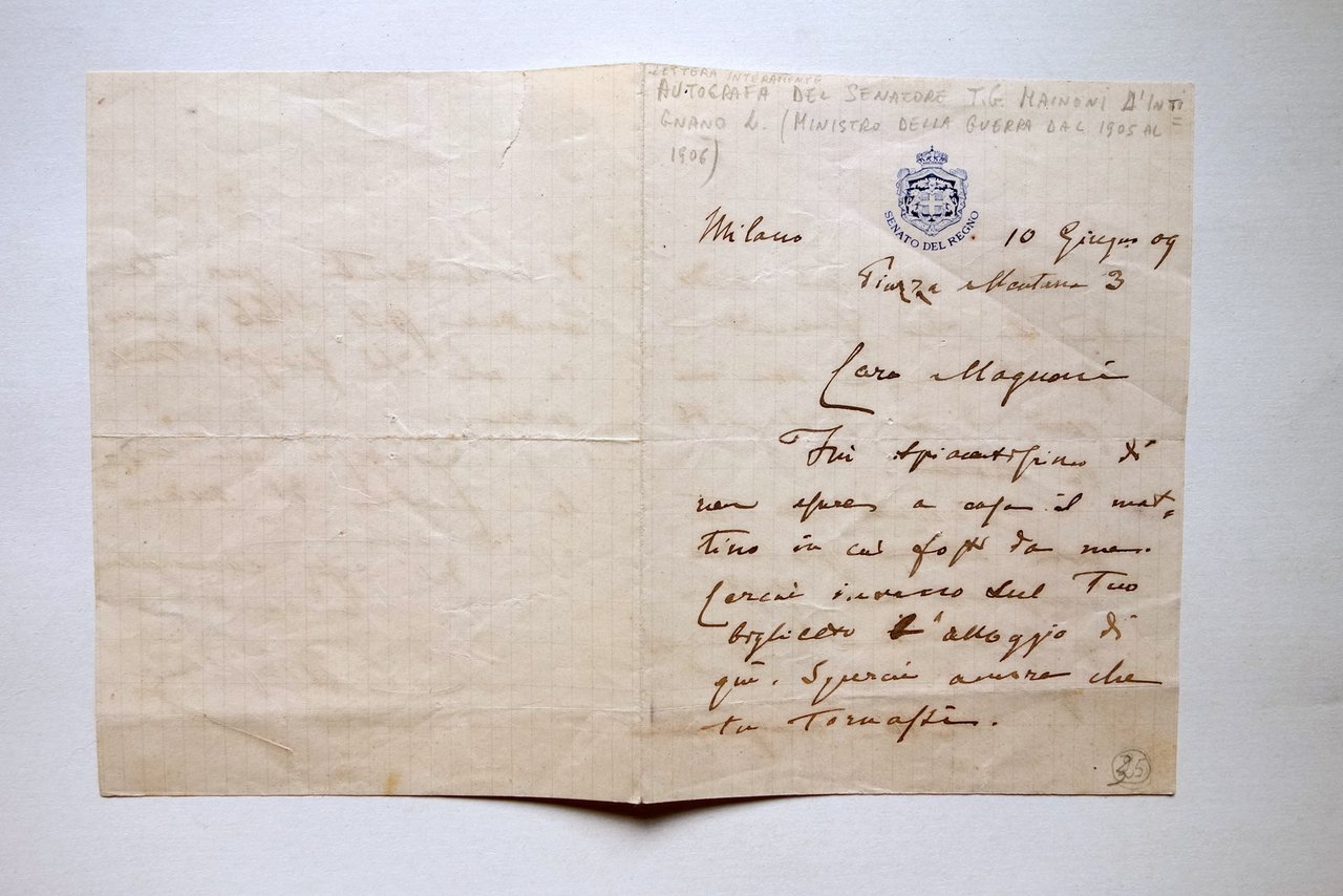 Lettera autografa, Luigi Majnoni d'Intignano (1841-1918) lettera autografa firmata datata Milano, 10 giugno 1909 Lettera autografa firmata su bifolio con intestazione de Il Senato del Regno; testo redatto su due facciate, con firma autografa al termine del testo. Al margine superiore della prima facciata breve rimovibile nota descrittiva a matita del precedente collezionista. Cm 13,5x10,5. Condizioni di conservazione Buone condizioni con tracce d'uso, normali tracce di pieghe di spedizione, margine superiore della terza e quarta facciata con un piccolo strappetto (vedi foto). SC03.D17420 N