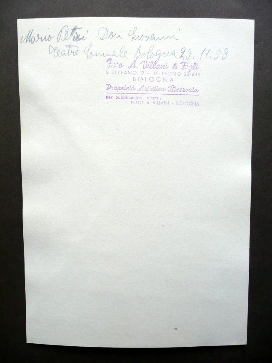 Fotografia autografa, Mario Petri (Perugia 1922 - Città della Pieve 1985) Fotografia autografa firmata Foto A. Villani e Figli - Bologna Datata 25 Novembre 1953 Foto Villani - Bologna; fotografia originale in b/n, datata Bologna (Teatro Comunale), 25/11/1953; parte inf. con tre righe di dedica autografe e firmate a penna (vedi foto); retro con datazione e un'ulteriore annotazione a penna del precedente collezionista; timbro recante i dati del fotografo (vedi foto). Cm 17,5x12,5. Condizioni di conservazione Esemplare in buone condizioni con minime tracce d'uso; un margine est. con due leggere e poco visibili tracce di vecchia incollatura (probabilmente chiusura di busta; vedi foto). SC03.D12414 N