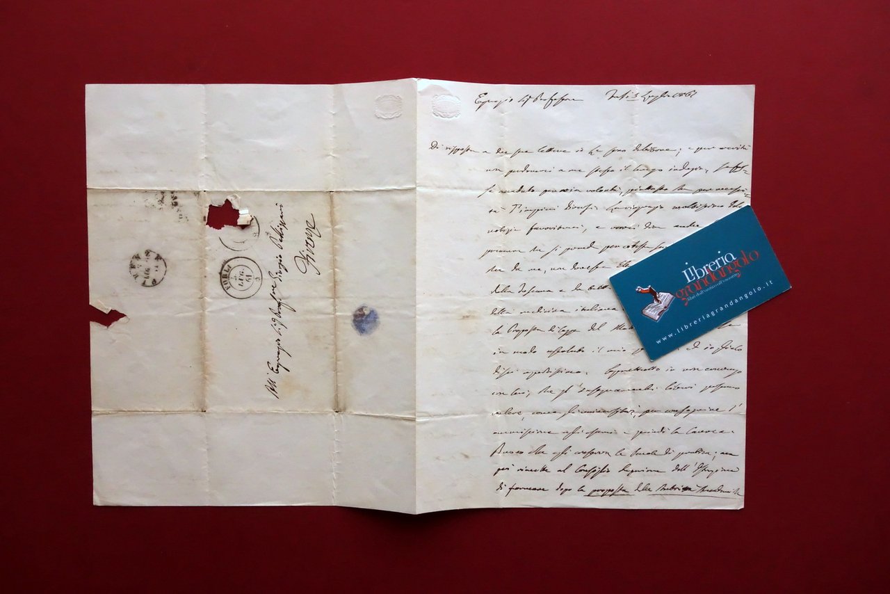 Lettera autografa, Maurizio Bufalini (1787 - 1875) lettera autografa firmata datata Forlì, 5 luglio 1861 Lettera interamente autografa firmata su bifolio in carta, datata Forlì, 5 luglio 1861; testo disposto su tre facciate, con firma autografa al termine della terza facciata (vedi foto); alla quarta indirizzo del destinatario, traccia del sigillo di chiusura in ceralacca e timbretti per spedizione postale. Cm 23x18. Condizioni di conservazione Buone condizioni con tracce d'uso, normali leggere tracce di pieghe per spedizione postale, poche pressoché trascurabili bruniture; alla terza facciata una piccola mancanza centrale con conseguente piccola perdita di testo e piccola mancanza al margine destro che non interessa il testo, quest'ultima dovuta all'apertura della missiva. Per ulteriori dettagli vedi foto. Contenuto importante nonché interessante, ricco di commenti e analisi sulle riforme sui cambiamenti politici del tempo, con polemica nei confronti delle proposte del Matteucci. Indirizzata al medico Giorgio Pellizzari. Citato anche Augusto Murri. SC03.D18763 N