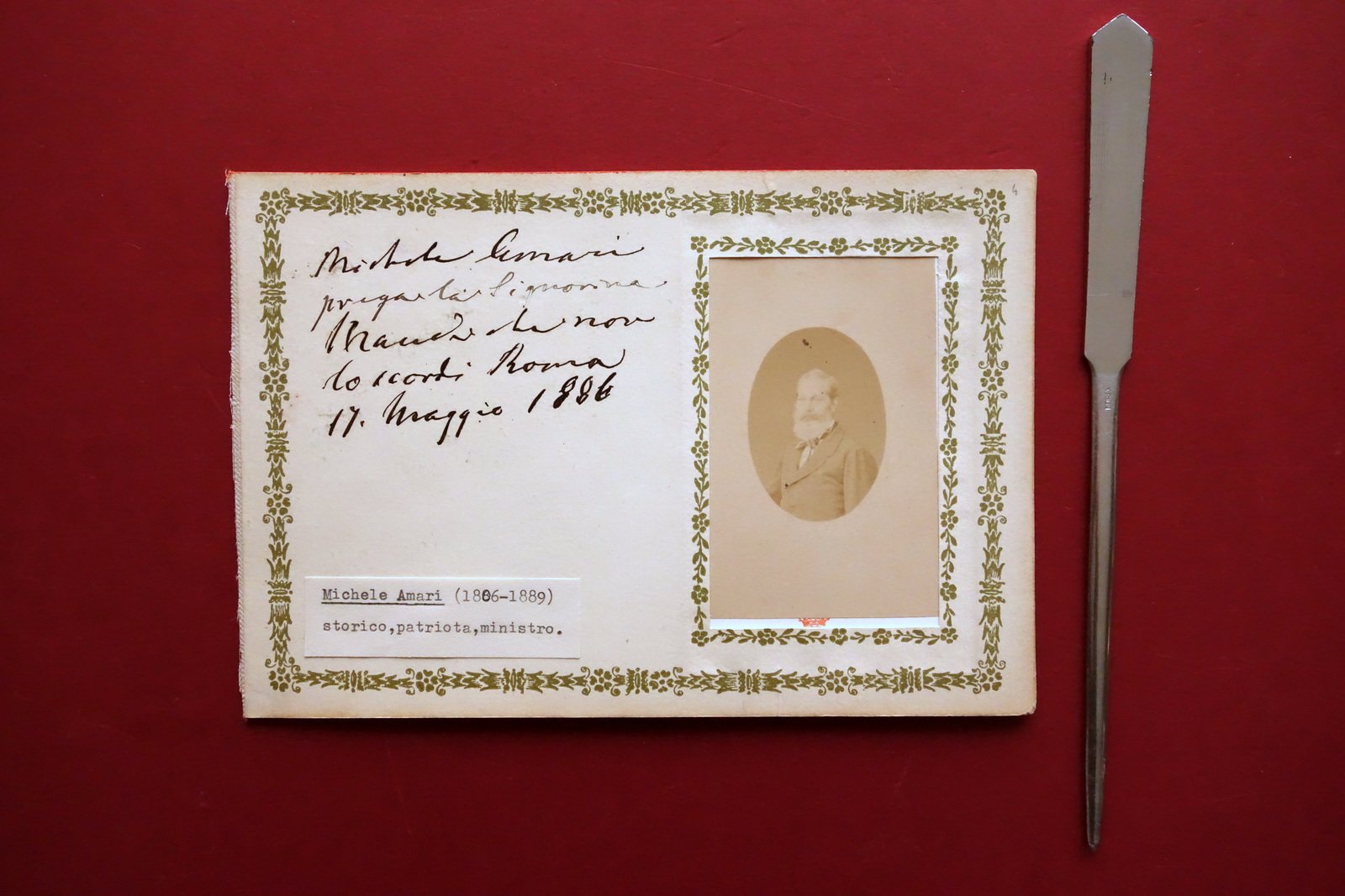 Autografo, Michele Amari (1886-1889) cartoncino autografo firmato (vecchia pagina d'album) datato Roma, 17 maggio 1886 Roma,1886; cartoncino autografo firmato (vecchia pagina di album) corredato da bella fotografia originale dell'Amari. Al margine inferiore del cartoncino è applicato lo schedino descrittivo del precedente collezionista (vedi foto). Dimensioni: cm 13x19. Condizioni di conservazione Buone condizioni con minimi segni del tempo, lievi accenni di ingiallimento per lo più ai margini del cartoncino. Per ulteriori dettagli vedi foto. SC03.D19678 N