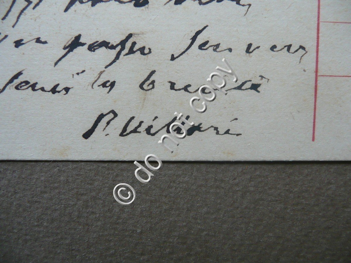 Cartolina postale autografa, Pasquale Villari (Napoli 1827 - Firenze 1917) cartolina postale interamente autografa e firmata S.d. (1917 data del timbro postale), cartolina postale con 5 righe autografe e firmate dal Villari, nome del destinatario anch'esso autografo, viaggiata. Cm 9x14. Parte sup. con una breve rimovibile nota a matita del precedente collezionista. Condizioni di conservazione Esemplare in buone condizioni con tracce d'uso, un piccolo lievissimo alone, angoli con minimi difetti, retro dei quattro angoli con lievi abrasioni e tracce di nastro adesivo dovute a precedente conservazione entro raccolta. SC03.D9450 N