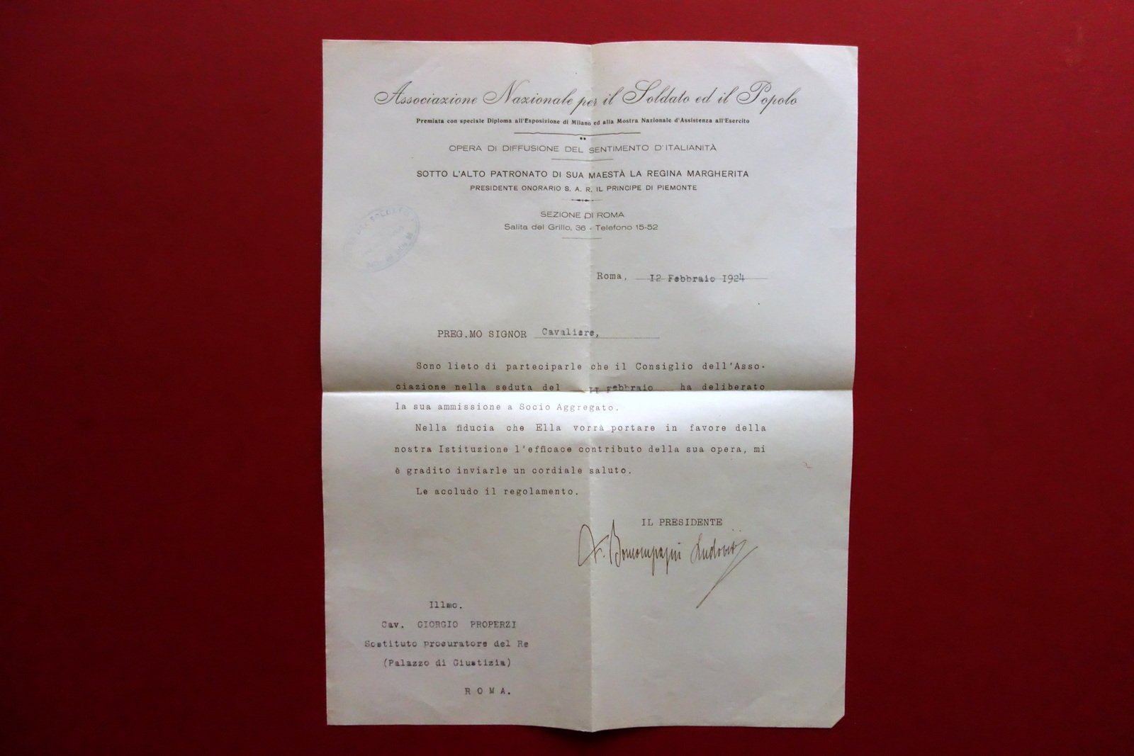 Roma, 1924; lettera a stampa su carta intestata dell'Associazione Nazionale per il Soldato ed il Popolo; sezioni bianche con compilazione dattiloscritta; firma autografa del Boncompagni Lodovisi al termine del testo. Dimensioni: cm 29x22,5.
