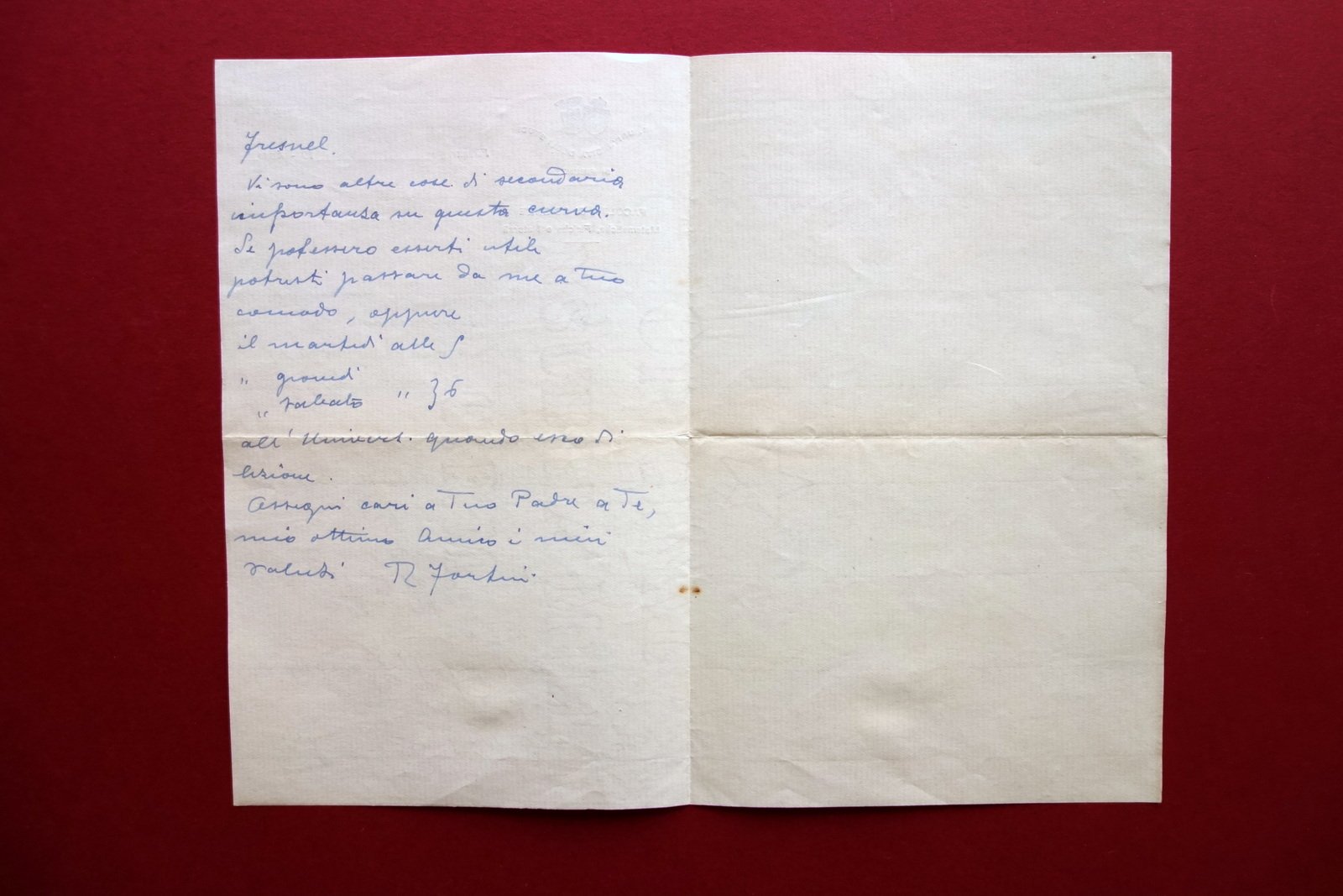 Lettera autografa, Roberto Fortini lettera autografa firmata su carta intestata dell'Università di Firenze - facoltà di scienze matematiche, fisiche e naturali S. d.; lettera interamente autografa firmata su carta intestata; firma alla seconda facciata, al termine del testo. Cm 20,5x13. Condizioni di conservazione Molto ben conservata con normale traccia di piega centrale per spedizione. Diretta all'amico Zampighi, nella quale viene brevemente esposto il concetto di clotoide. SC03.D18374 N