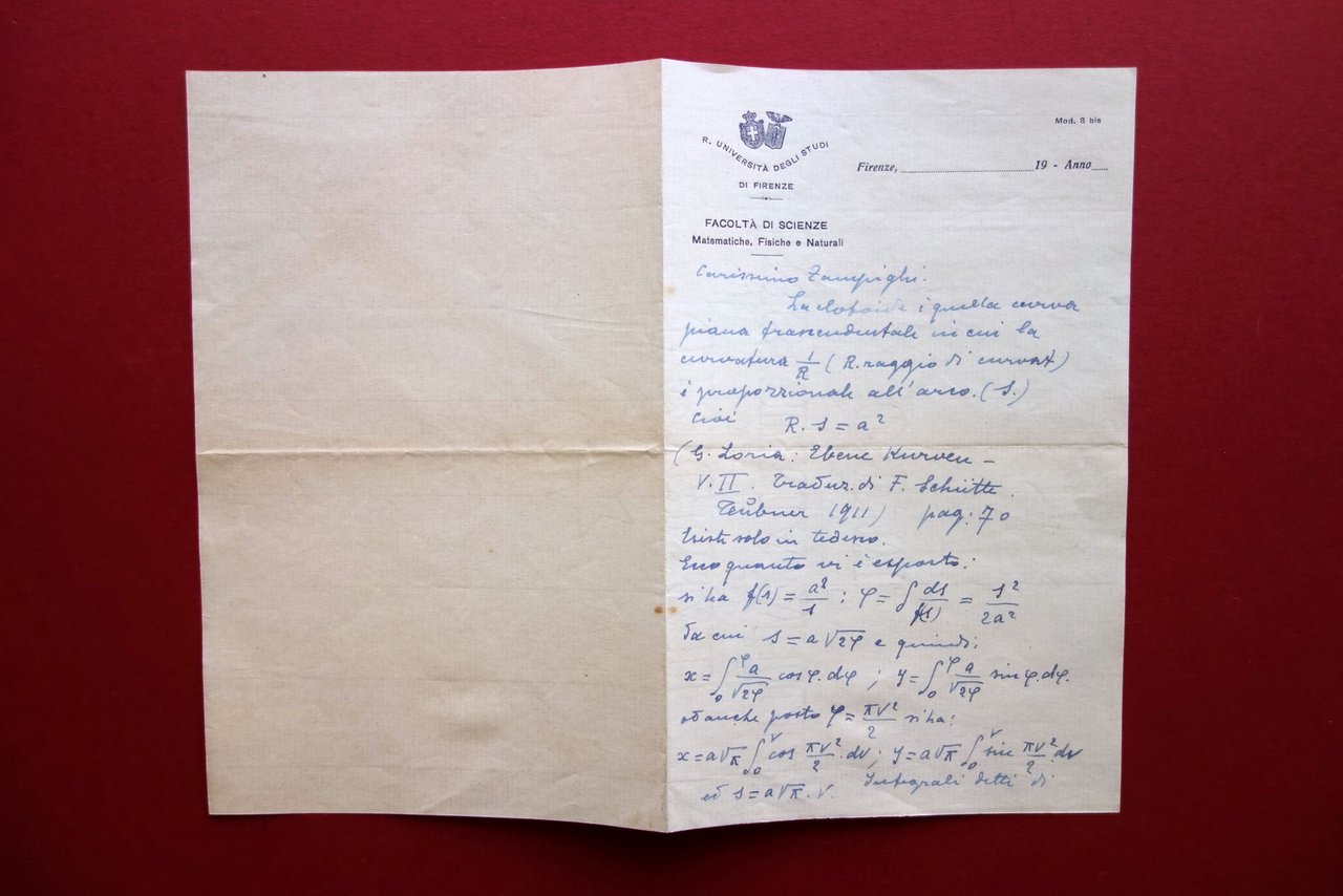Autografo Roberto Fortini Lettera Universit‡ di Firenze Matematica Clotoide