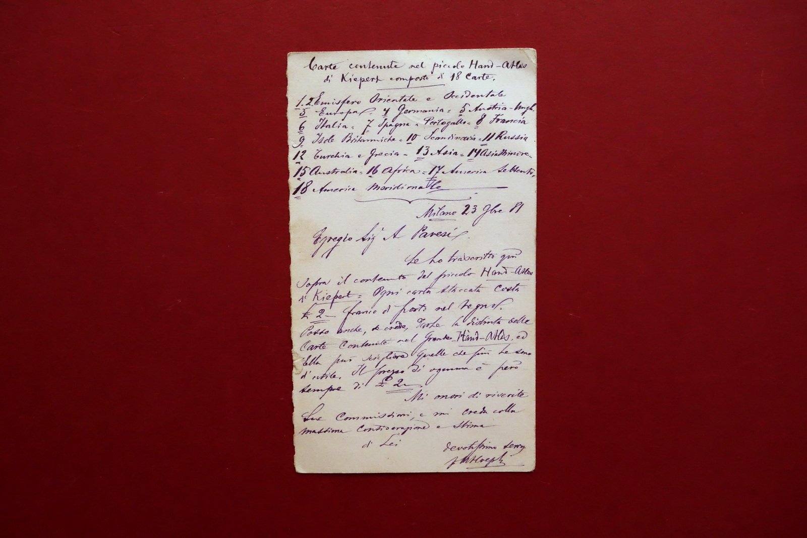 Autografo Ulrico Hoepli Cartolina Hand-Atlas Kiepert Milano 1881 Editore