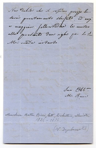 Large 8vo. 1½ pp. To a bookseller, clearing up a misunderstanding concerning the price of a dictionary that Ricci had bought from the recipient: "La lettera in cui Ella mi dava avviso della spedizione del Dizionario io la lessi con qualche fretta, e (cosa a me insolitissima) mi accadde di perderla. Indi è proceduto l'equivoco e la differenza del prezzo: ma poco ci voleva, mi sembra, a capacitarsi non essere tutto ciò che un semplice errore, una pura dimenticanza. Di questa già Ella mi aveva reso avvertito per mezzo dello zio, io stava per riparare lo sbaglio e non so davvero che cosa c'entrasse anche la sua del 14, e quella focosa insistenza. Non dubiti che il residuo prezzo le sarà prontamente sborsato, ed anzi a maggiore sollecitudine le unisco alla presente due righe per lo zio [.]". - Traces of folds. - From the collection of Eduard Fischer von Röslerstamm (1848-1915).