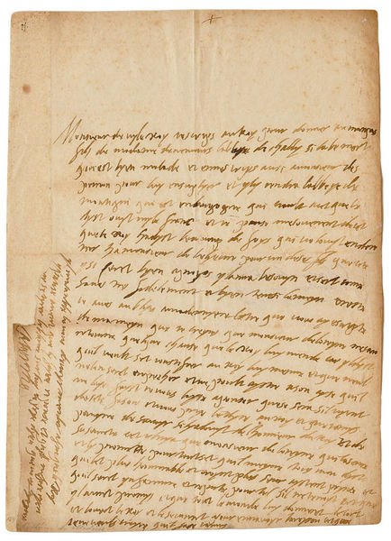 Folio (320 x 235 mm). 1 p., with address panel to verso. To secretary of state Nicolas de Neufville, seigneur de Villeroy. Catherine de' Médici was one of the great female letter writers of the Renaissance, drafting many of her political letters (as here) in her own hand. She had been Queen consort of France as wife of Henry II, but rose to political power after his death in 1559. She stood behind the brief reign of her eldest son Francis II and, upon his death only a year later, was appointed regent to her second son Charles IX (then only ten years old). He died in 1574, leaving Catherine to preside over the chaotic reign of her third son Henry III, a period of terrible civil and religious war in France. Despite the turmoil, Catherine was a remarkable administrator in a political landscape in which she could trust almost no one. The present letter, drafted in her own hand (in itself remarkable), is typical of her direct style. She informs the secretary of state, Villeroy, one of the few members of government with whom she was intimate, of her wish to grant the benefice of the Abbey of Chailly (on the edge of the Forest of Fontainebleau) to the marquis de Saint-Sorlin, son of the Duchess de Nemours (and later duc de Nemours and Henry I of Savoy). She also makes provision for the benefice of Martigny-le-Comte (Burgundy) and arranges benefices for the sons of the statesman Pomponne de Bellièvre (who later became chancellor of France). The letter is apparently unpublished. It does not appear in the collected "Lettres de Catherine de Médicis" (1880-1943, 10 vols.), though a letter of 13 November 1581 (vol. VII, p. 415) addressed to the duc d’Épernon, on the same subject, allows us to date ours with some confidence. - Old folds, light browning, loss to blank left-hand margin, just touching a word of text and possibly the date, but avoiding the signature, neatly repaired, three further neat repairs to verso. Provenance: Otto August Schulz, Leipzig.