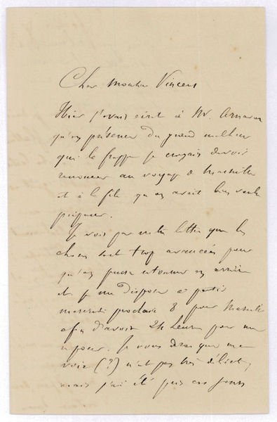 Small-8vo. 3 pp. on bifolium. To the journalist and music critic Charles Vincens, concerning a party in honor of the industrialist and patron of the arts Louis-Honoré Arnavon. Considering a "great misfortune" that had struck Arnavon, Naudad thought that the party in Marseille was cancelled but Vincens had informed him that it would still take place: "Hier j'avais écrit à Mr Arnavon qu'en présence du grand malheur qui le frappe je croyais devoir renoncer au voyage de Marseille et à la fête qu'on avait bien voulu préparer". - Nadaud was expecting a swift recovery from a mild illness and looking forward to be hosted by the mutual friend Alexis Rostand in Marseille. - Minimal foxing.