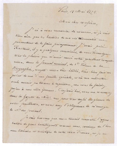 12mo. 1½ pp. To thank the unnamed recipient, probably the journalist Charles Vincens of the Journal musical and the Gazette du Midi, for favourable reviews: "J'ai a vous remercier de nouveau, et je suis bien aise que les hasards de ma vie tourmentée me permettent de le faire promptement. J'avais prié Rostand, il y a quelques semaines, de nous temoigner tout le plaisir que m'avait causé votre excellent compte-rendu, dans le Journal musical, du 1er Volume de la Biographie, compte-rendu très étudié, très bien fait au point de vue d'une feuille spéciale, et où ma modestie seule aurait pu trouver à reprendre, car vous la faisiez passer à une rude épreuve. Aujourd'hui, vous me consacrez dans la Gazette du Midi une part tout aussi élogieuse de votre feuilleton, et vous avez l'obligéance de m'envoyer le No. du journal [.]". The mutual friend mentioned was the banker and amateur composer Alexis Rostand (1844-1919). - With traces of former mounting.