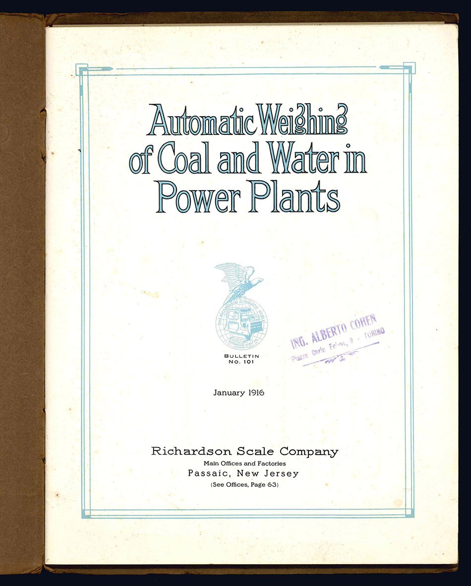 In 4to (mm 267x205); pp. 63, [1], con numerose illustrazioni in bianco e nero (una in oro) nel testo. Testo ed illustrazioni entro cornici azzurre. Contiene anche due fogli volanti contenenti "A desiderable form to follow when giving information with inquiries for Richardson Scales" e "A desiderable form to follow when giving information with inquiries for Merrick Conveyor Weightometers".