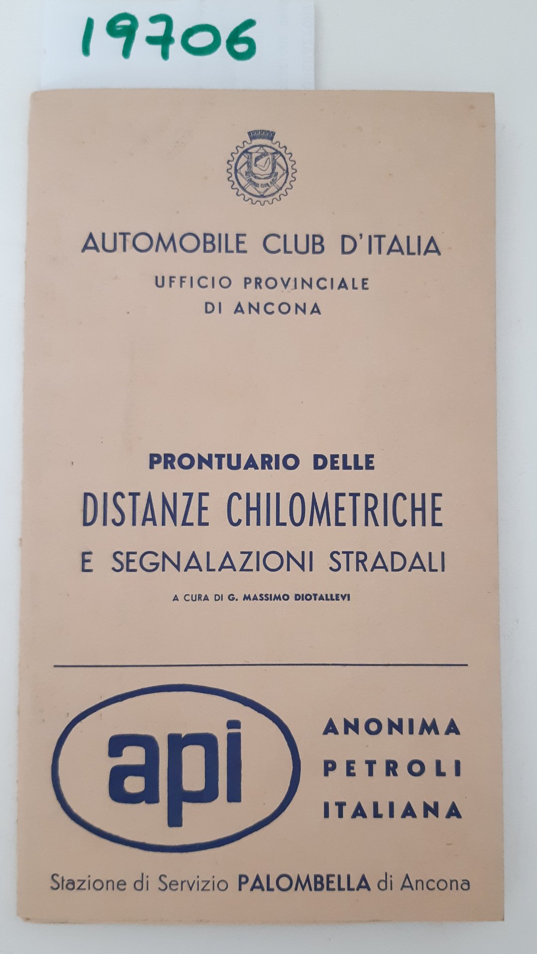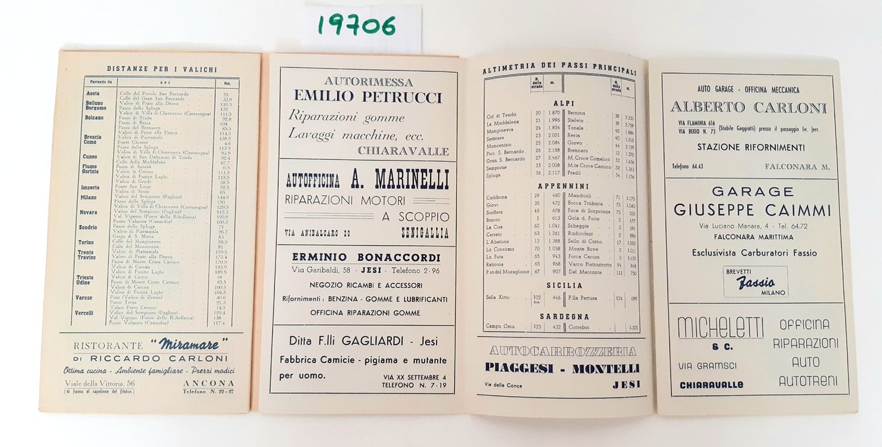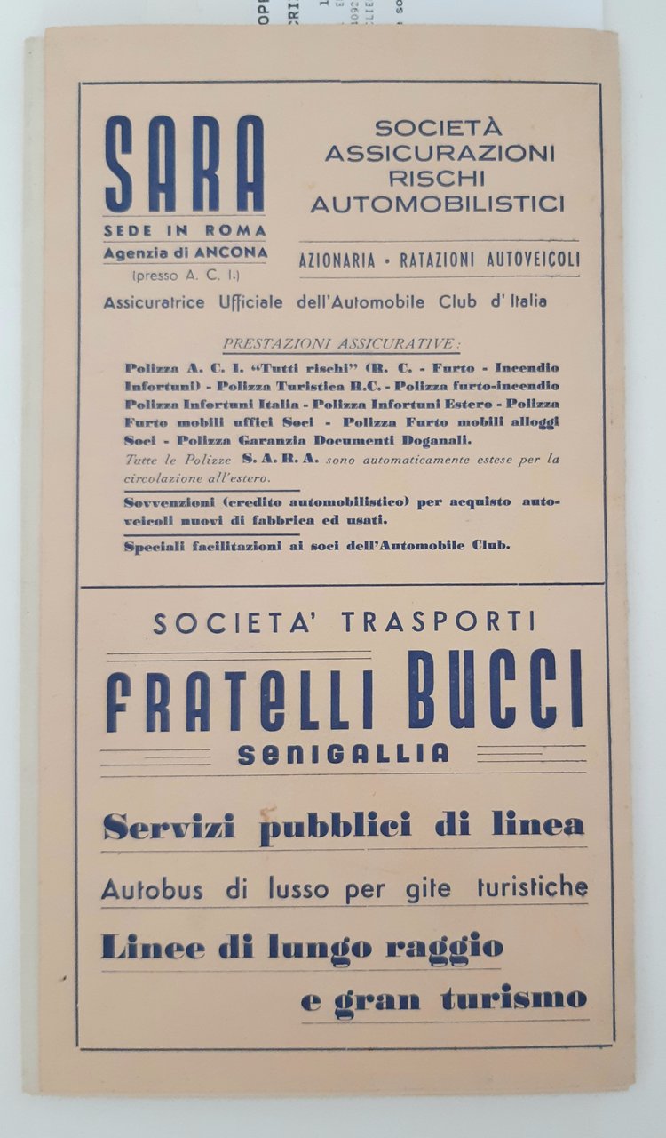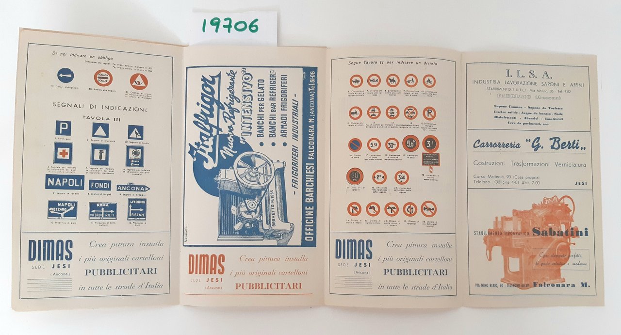Legatura morbida editoriale con alcune sporcizie e aloni ai piatti, all'interno due pieghevoli uno con pubblicità e segnaletica di pericolo l'altro con tabella con distanze chilometriche fra i capoluoghi di provincia dimensioni della tabella centimetri 60 * 44, dimensioni dell'opuscolo cm 22 * 12,6