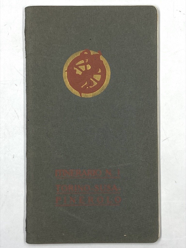 Brossura editoriale con fregio rosso a rilievo su fondo oro sul piatto anteriore, cm14x25, pp 51 (1) + (8); 11 carte di percorso a piena pagina, una carta generale ripiegata, 100 fotografie in nero e 5 carte topografiche nel testo. In fine alcune pagine pubblicitarie (Fabbrica Italiana Pianoforti, Carrozzerie Fratelli Solaro, Fabbrica Automobli ITALA, libreria Casanova) e sul piatto posteriore annuncio FIAT in rosso col marchio a rilievo.