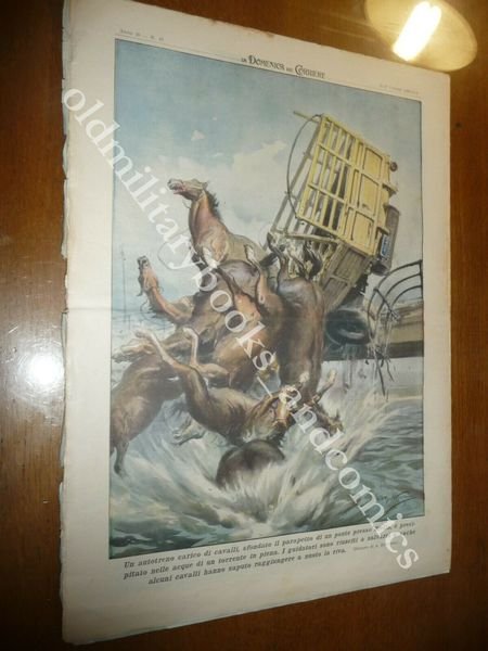 DESCRIZIONE: Domenica del Corriere, Milano, Anno 40 n. 43 (16 ottobre 1938). COPERTINA: Un uragano a Long Island fa strage delle eleganti case. RETRO: Autotreno carico di cavalli sfonda parapetto di un ponte presso Biella. La Domenica del Corriere è stato un popolare settimanale italiano fondato a Milano nel 1899 e chiuso nel 1989. Apparve per la prima volta nelle edicole l'8 gennaio 1899 come supplemento illustrato del Corriere della Sera. Stampata in grande formato (sul modello del domenicale La Tribuna illustrata), aveva 12 pagine e veniva distribuita gratis agli abbonati del Corriere, oppure si poteva acquistare in edicola per 10 centesimi. La prima e ultima di copertina erano sempre disegnate. Il Corriere si avvaleva di un giovane disegnatore, Achille Beltrame, allora sconosciuto, a cui veniva affidato in ogni numero il compito di rendere con la sua tavola il fatto più interessante della settimana. Dopo la sua morte nel 1945, fu sostituito da Walter Molino che, come il suo predecessore, firmò memorabili copertine. A differenza dei settimanali dell'epoca, la Domenica del Corriere diede ampio spazio alle fotografie e ai disegni, e questo fu uno dei motivi del suo successo. CONDIZIONI: Ottime piccoli strappetti con azzurrina. PESO / WEIGHT: 200 gr. without package